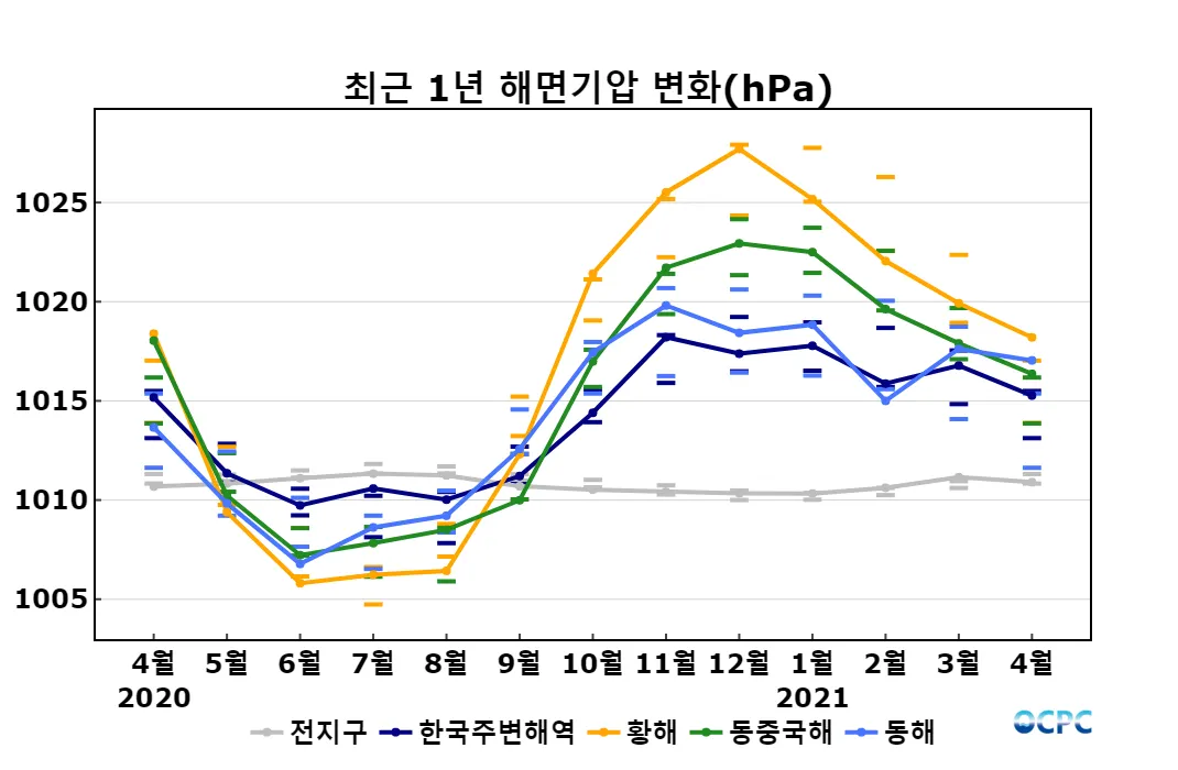 한국주변해역의 해면기압은 평년과 비슷했으나 동해와 황해는 평년보다 높았습니다.