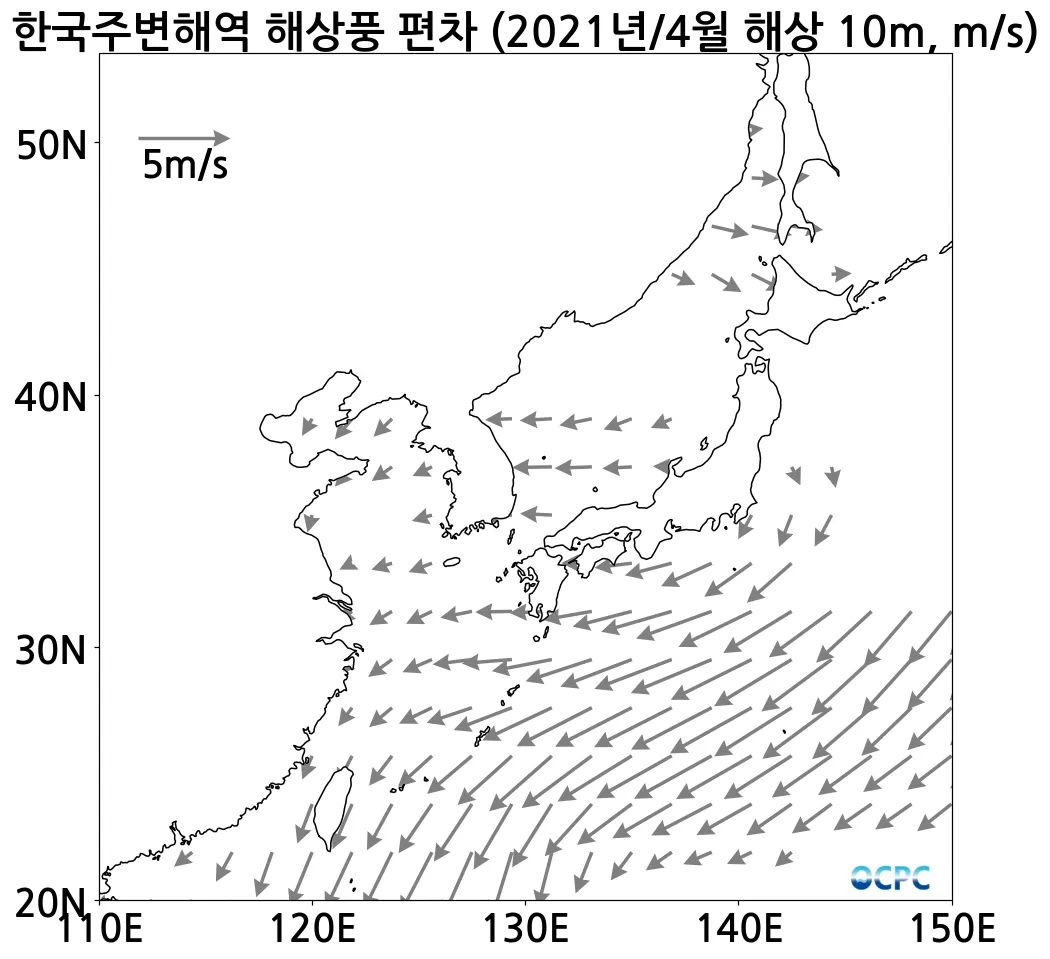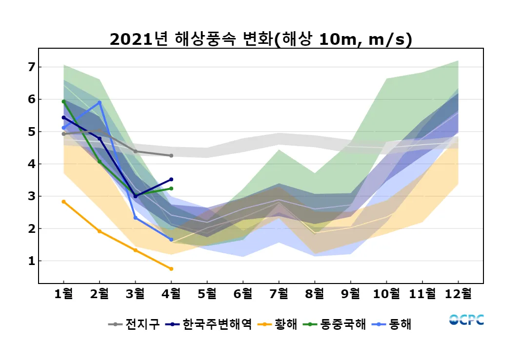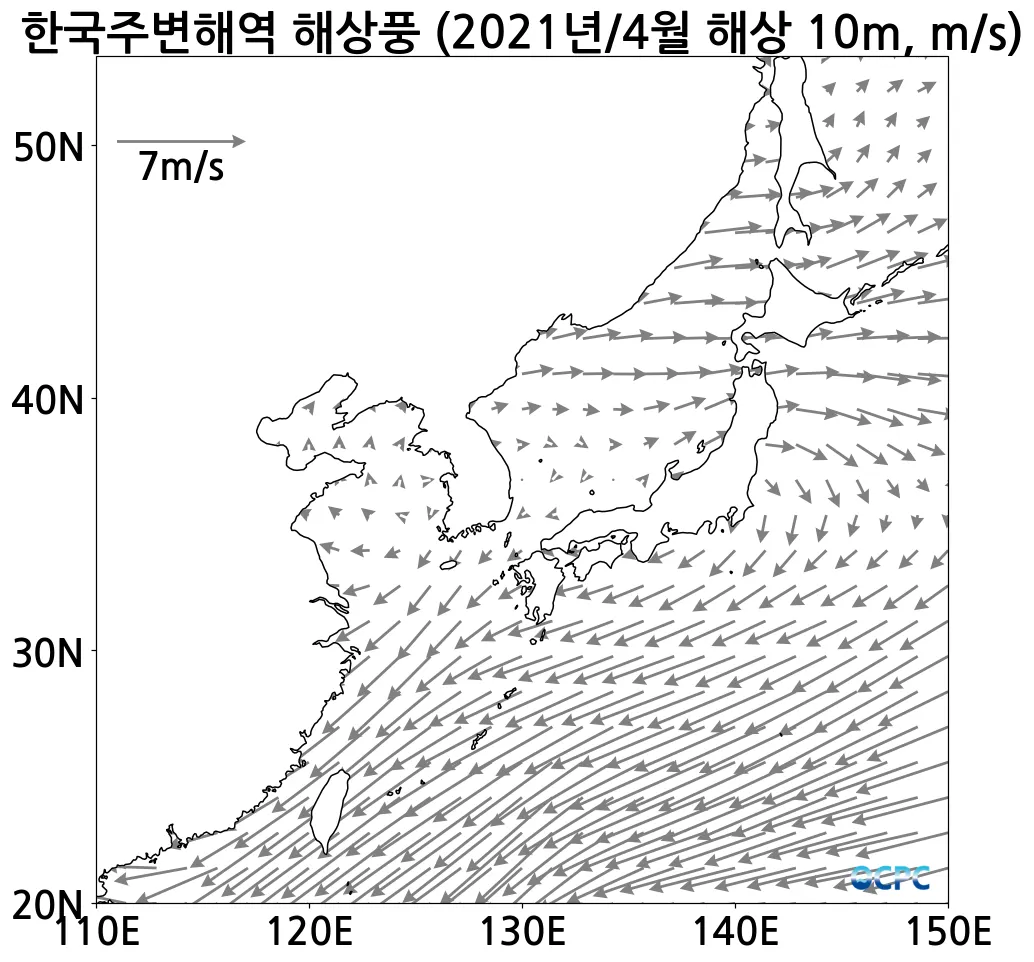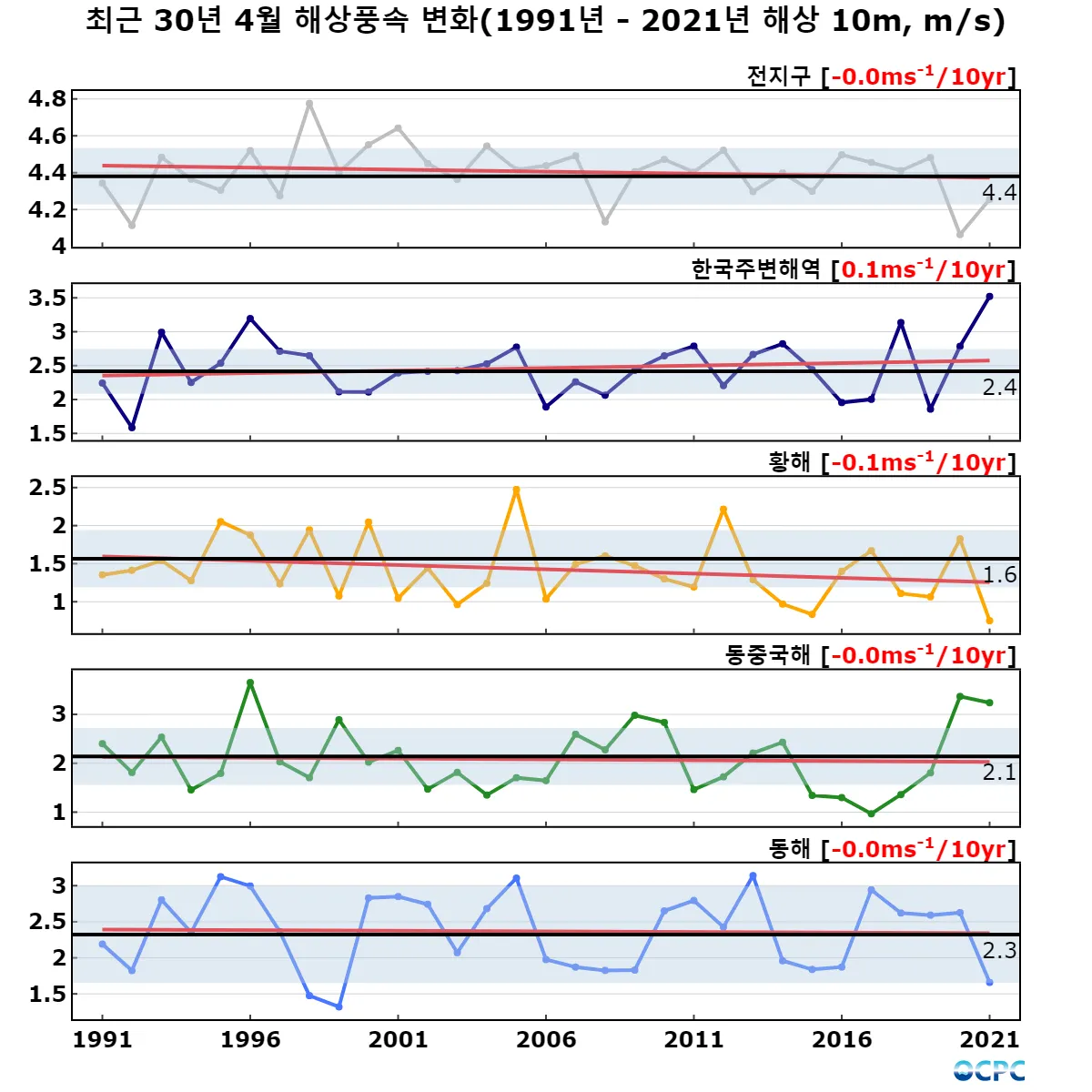 최근 30년 동안 4월 해상풍속은 한국주변해역에서 10년마다 약 0.1 m/s씩 증가하는 추세이며, 황해에서는 10년마다 약 0.1 m/s씩 감소하는 추세입니다.