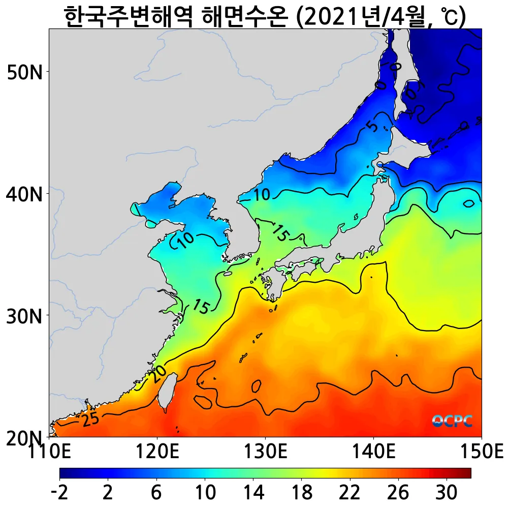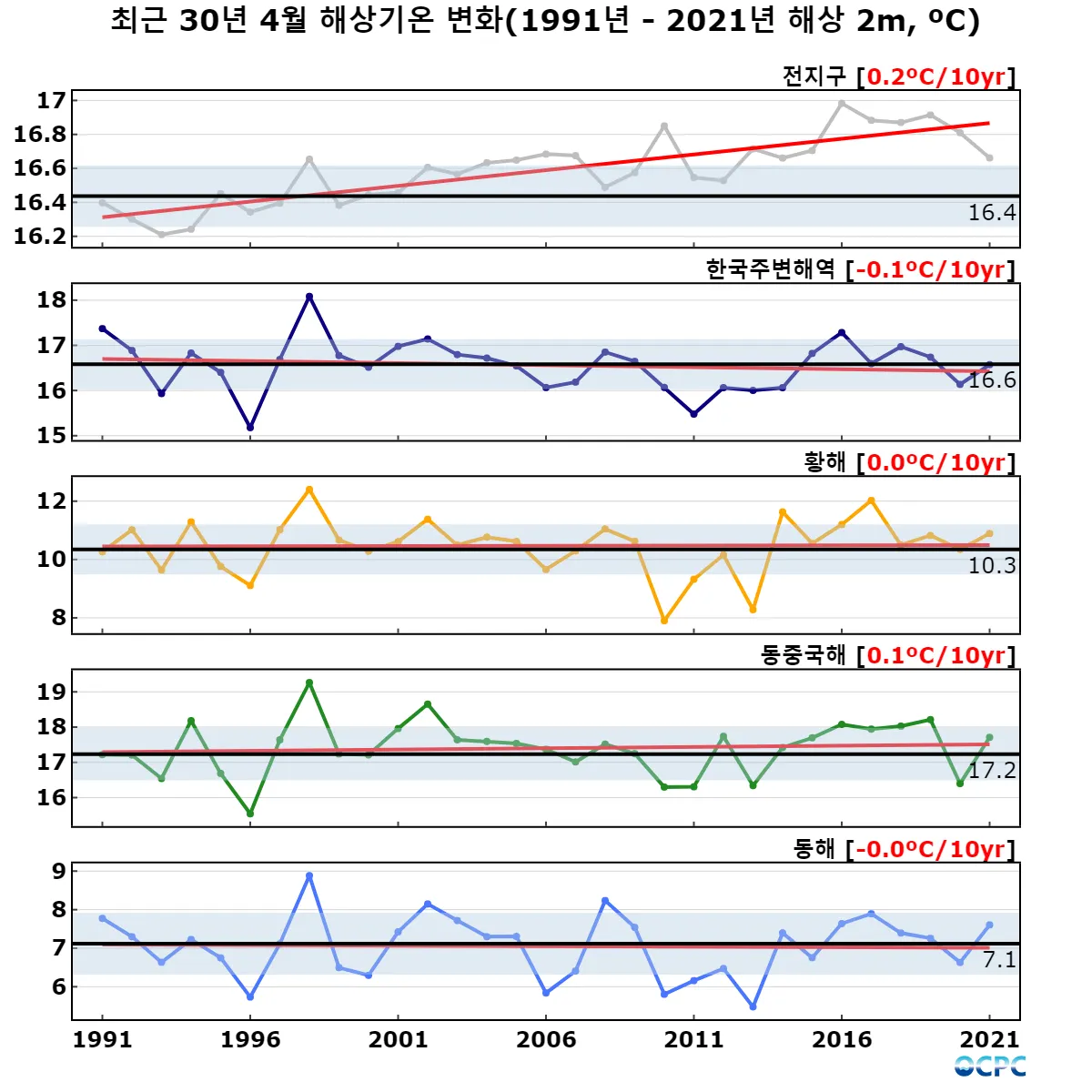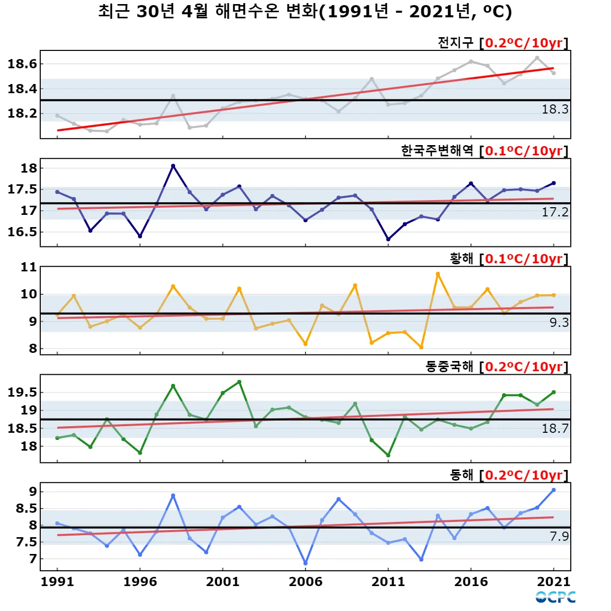최근 30년 동안 4월의 해면수온은 꾸준히 높아지고 있으며, 전지구해역은 10년마다 0.2 °C, 한국주변해역과 황해는 0.1 °C, 동중국해와 동해는 0.2 °C씩 상승하는 추세입니다.