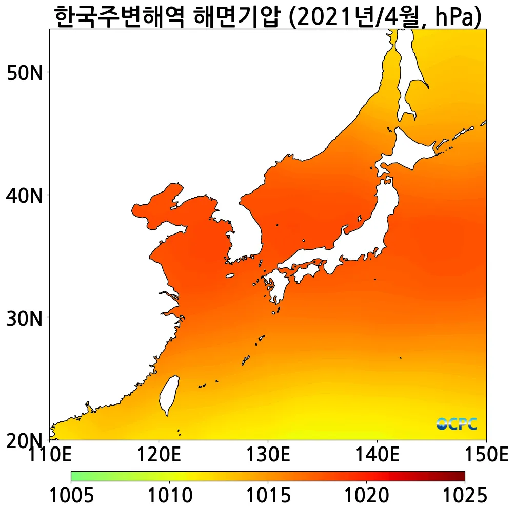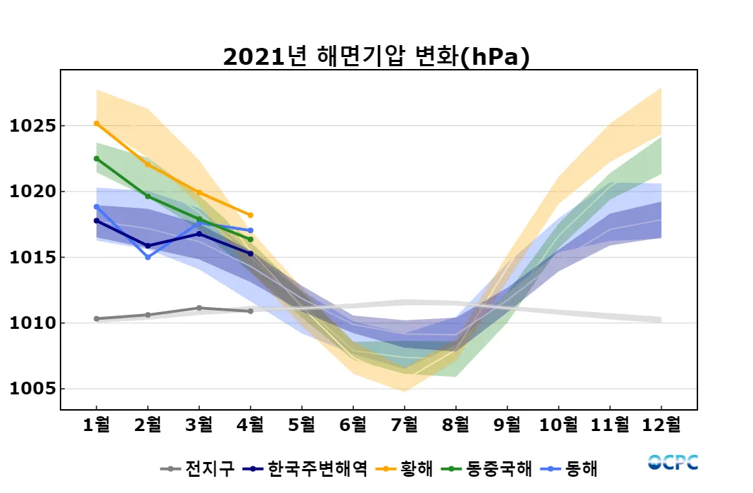 최근 30년 동안의 전지구 4월 평균 해면기압은 평년 수준이었으나, 황해, 동중국해, 동해는 10년마다 약 0.3 hPa 증가하는 추세입니다.