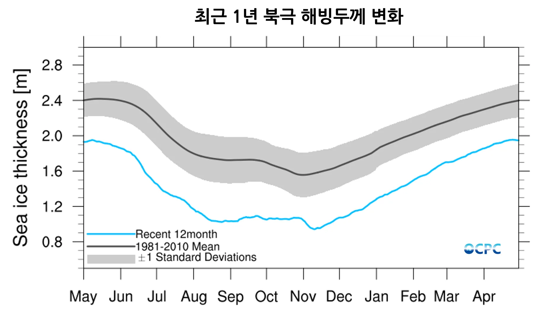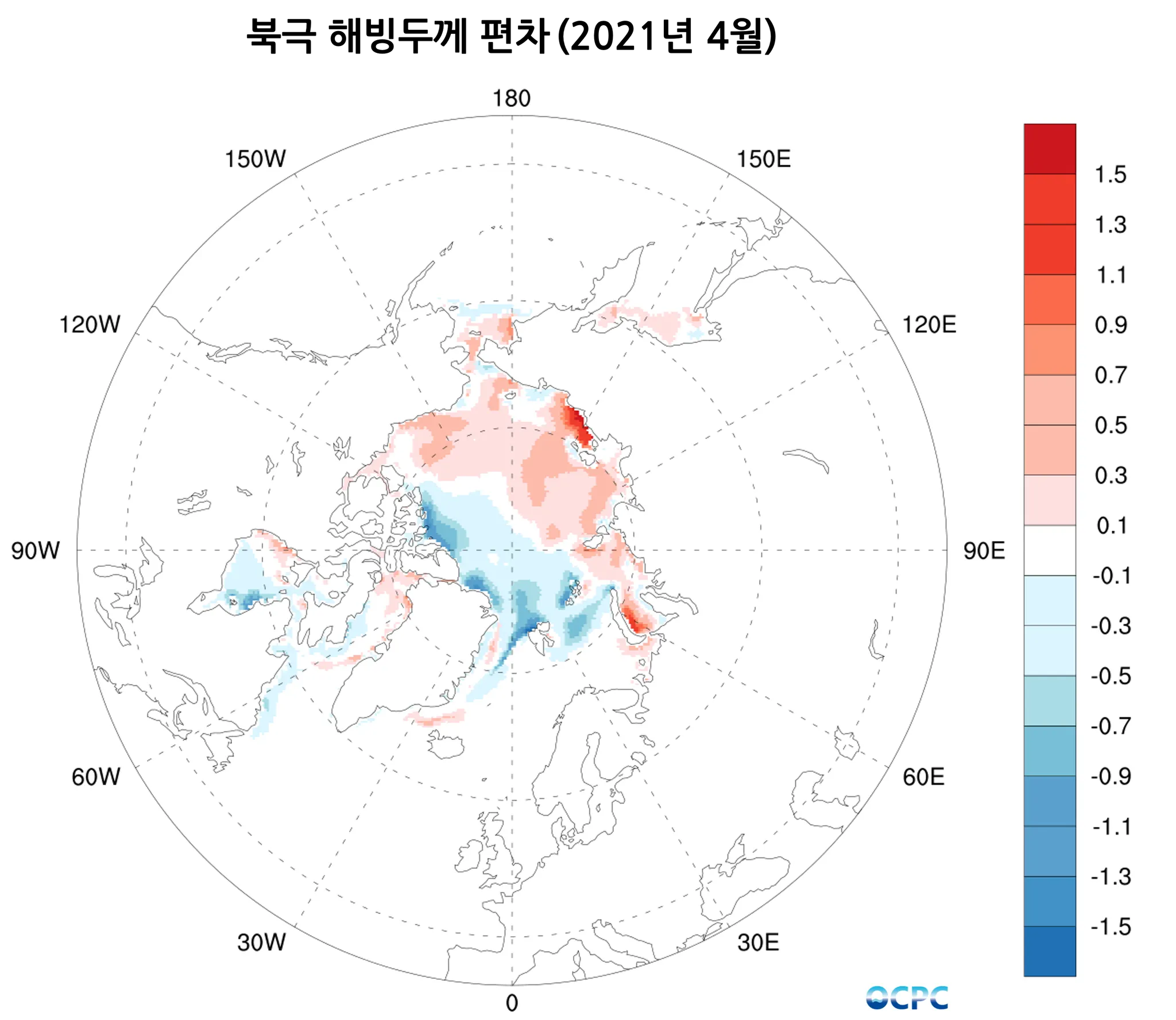 북극 해빙 두께 분포의 최근 10년(2011~2020년) 평균 대비 편차는 대서양측 감소와 태평양측 증가의 쌍극자 양상을 보였습니다.