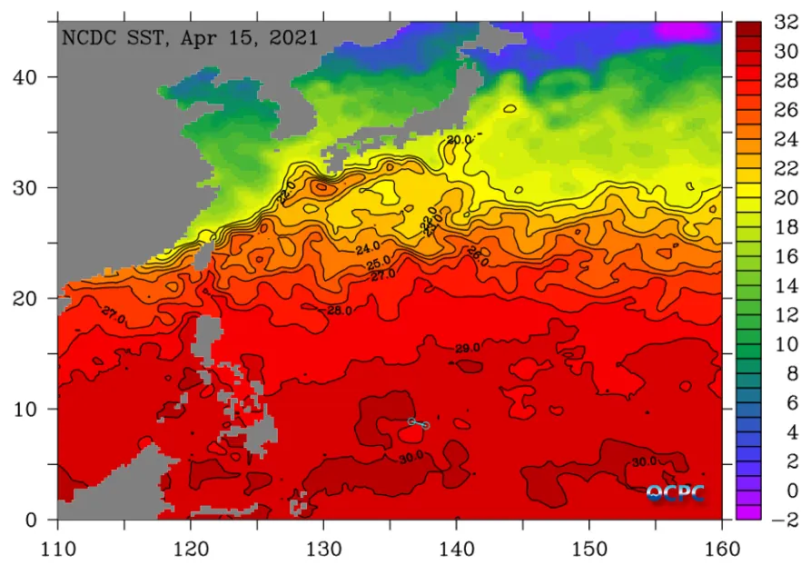 2호 태풍 수리개 발생 직후 (2021년 4월 15일) 해면수온(°C) 분포 (하늘색선/원: 4월 14~15일 태풍 수리개의 1일 간격 위치 및 경로)