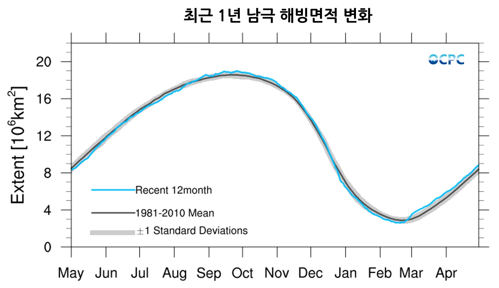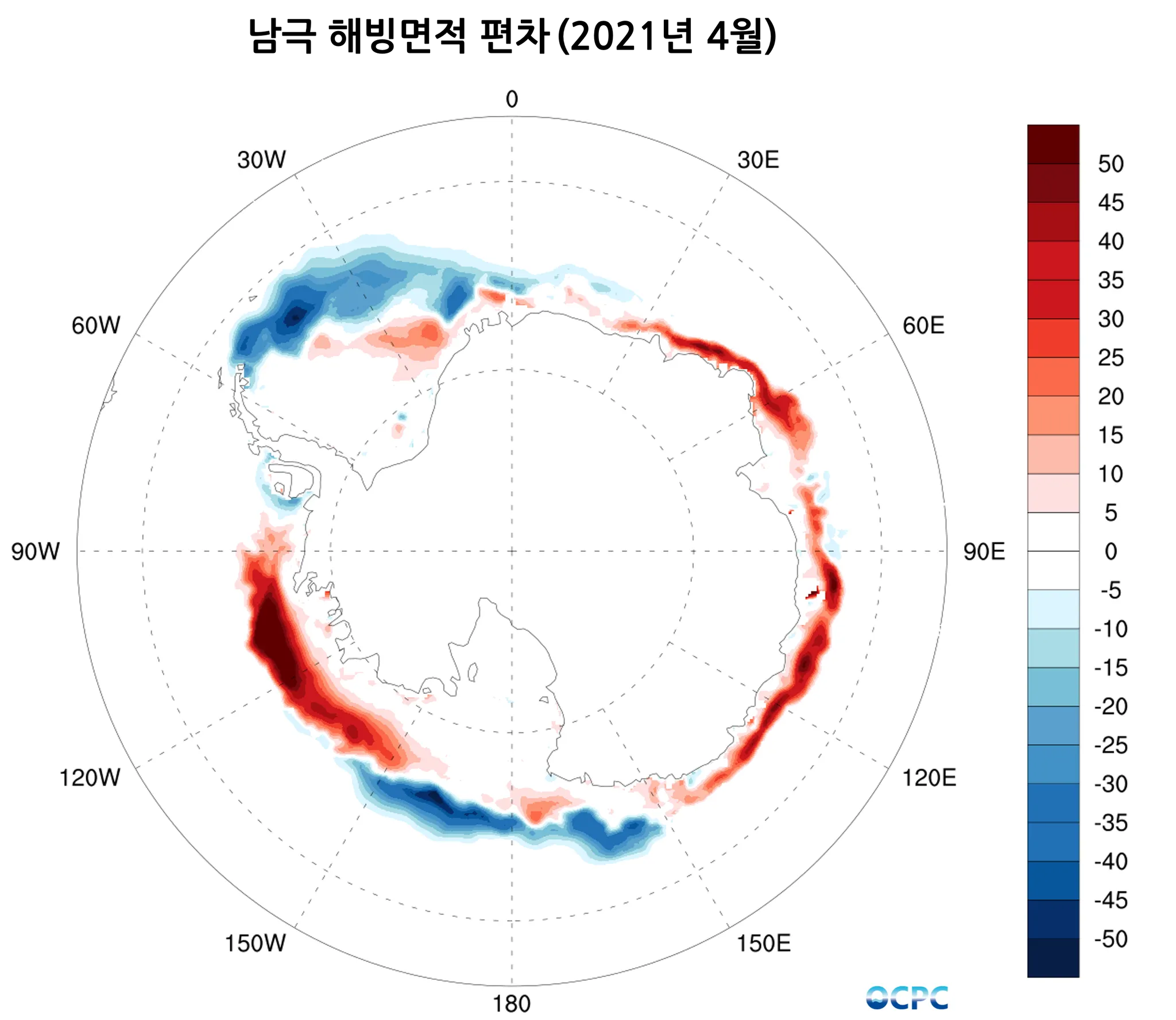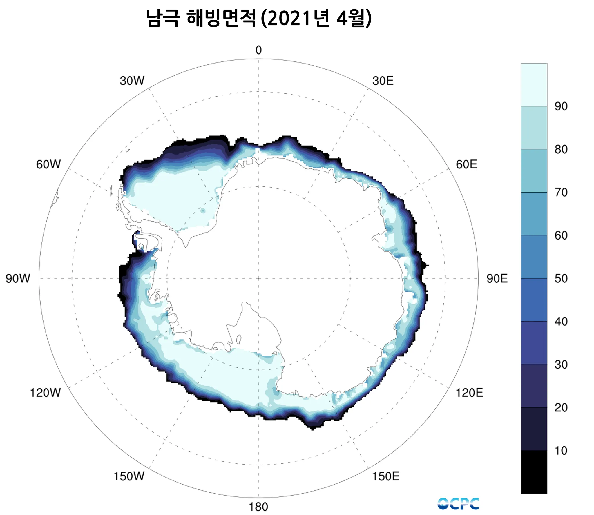 남극 해빙면적은 웨델해(Weddell Sea) 북서부와 로스해(Ross Sea) 북부에서 작았으며, 다른 해역에서는 대체로 평년보다 컸습니다.