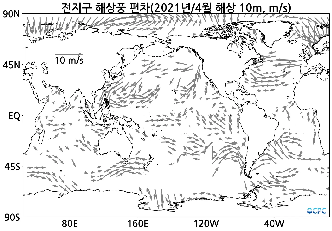 제2호 태풍 수리개(Surigae)의 영향으로 북서태평양 아열대 해역에서 반시계 방향 해상풍 편차가 나타났습니다.