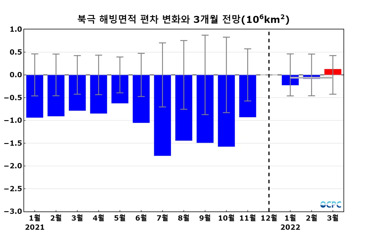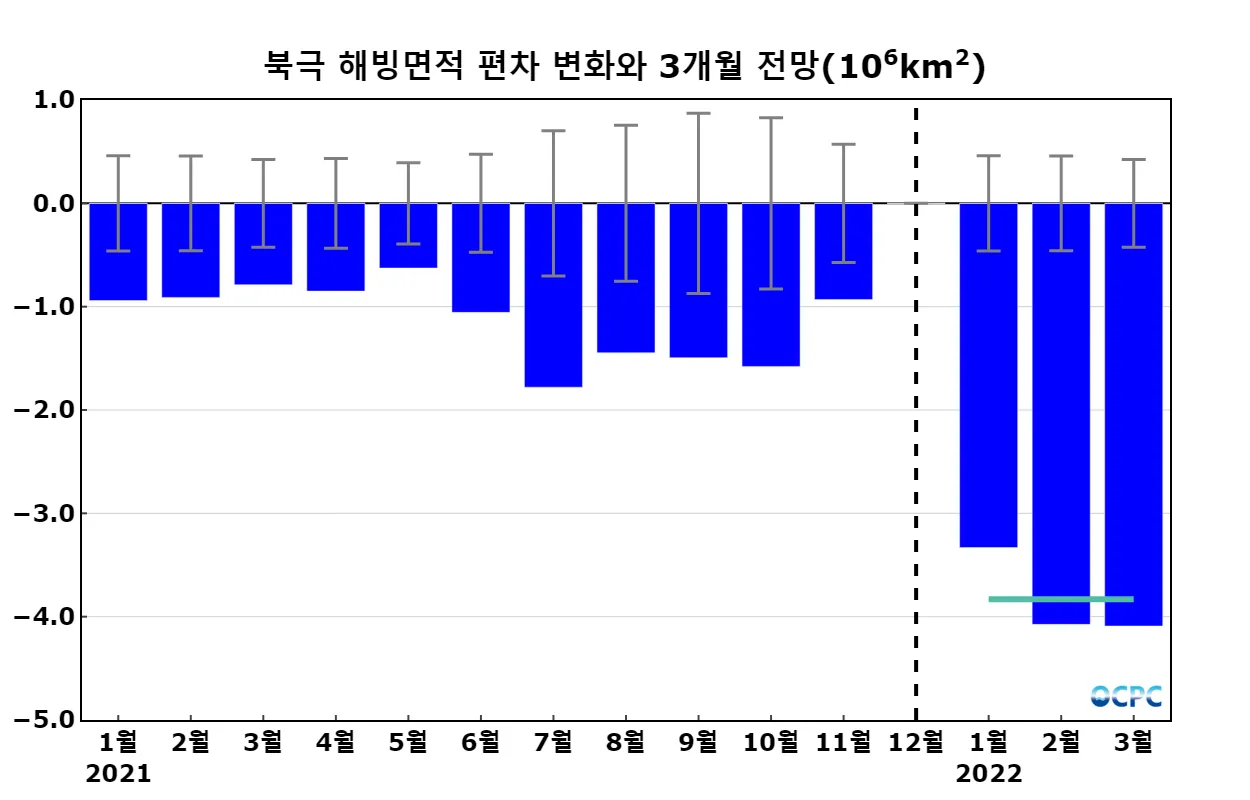 북극 해빙면적의 평년대비 감소율은 1월에서 2월로 가며 커지고, 3월은 2월과 비슷할 것으로 전망됩니다.