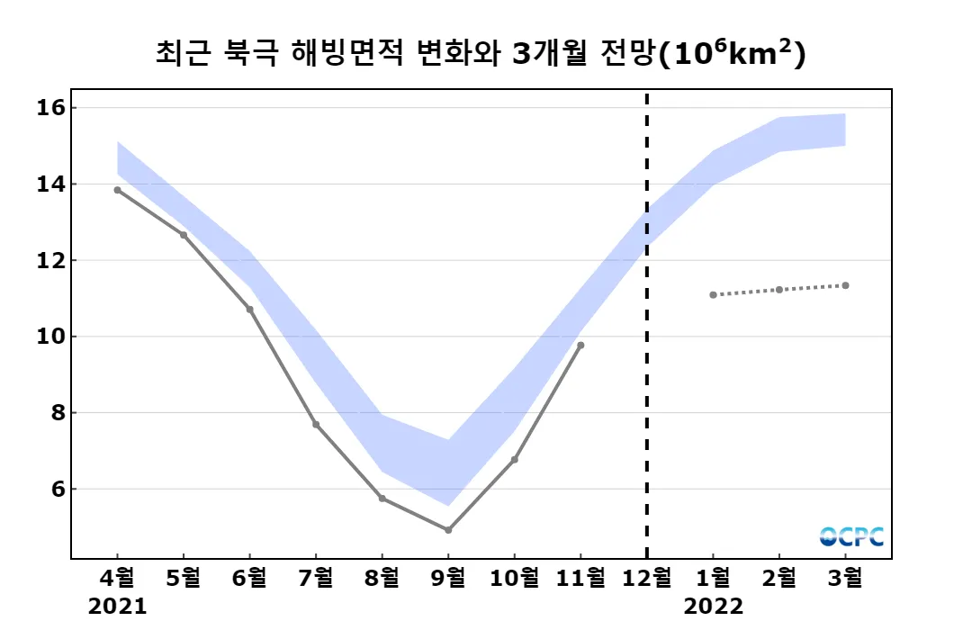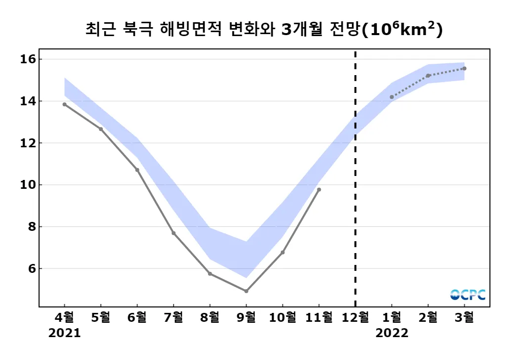 북극 해빙면적은 1,499만km²로 평년과 비슷할 것으로 전망됩니다.