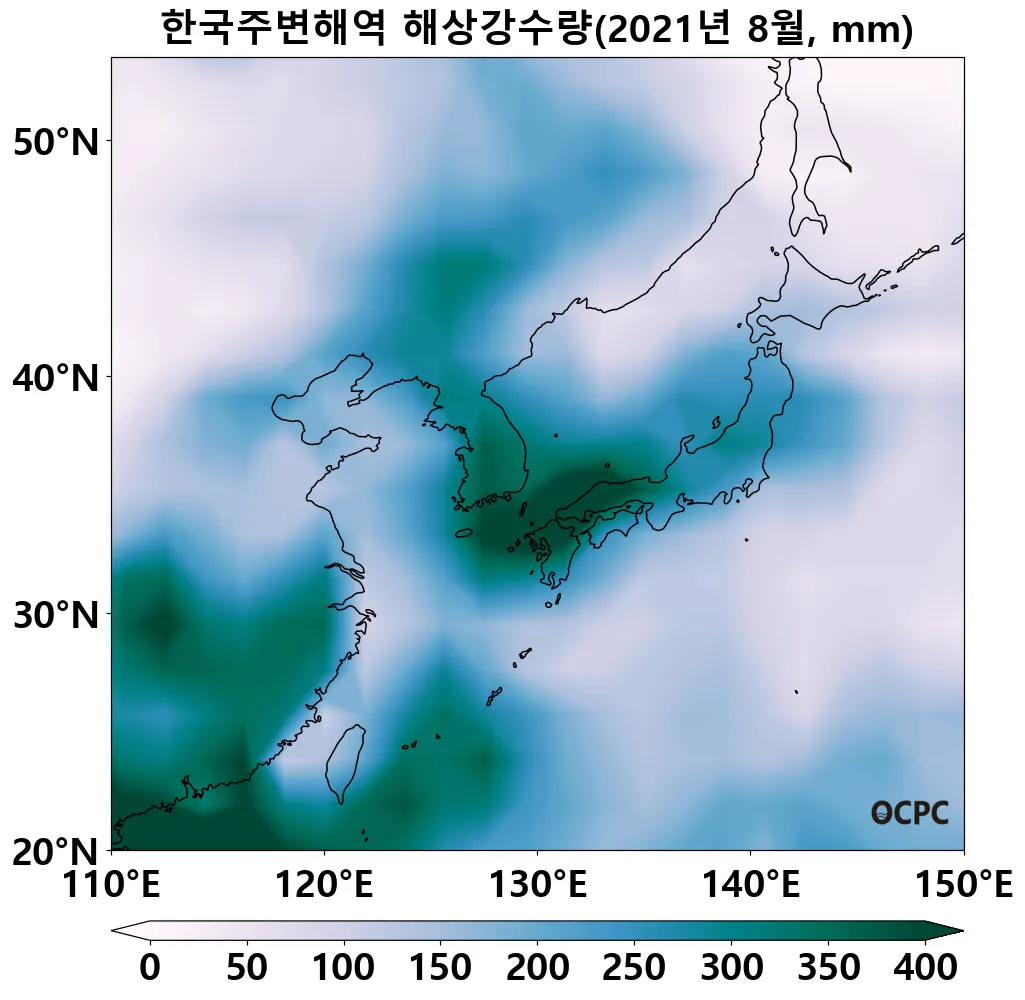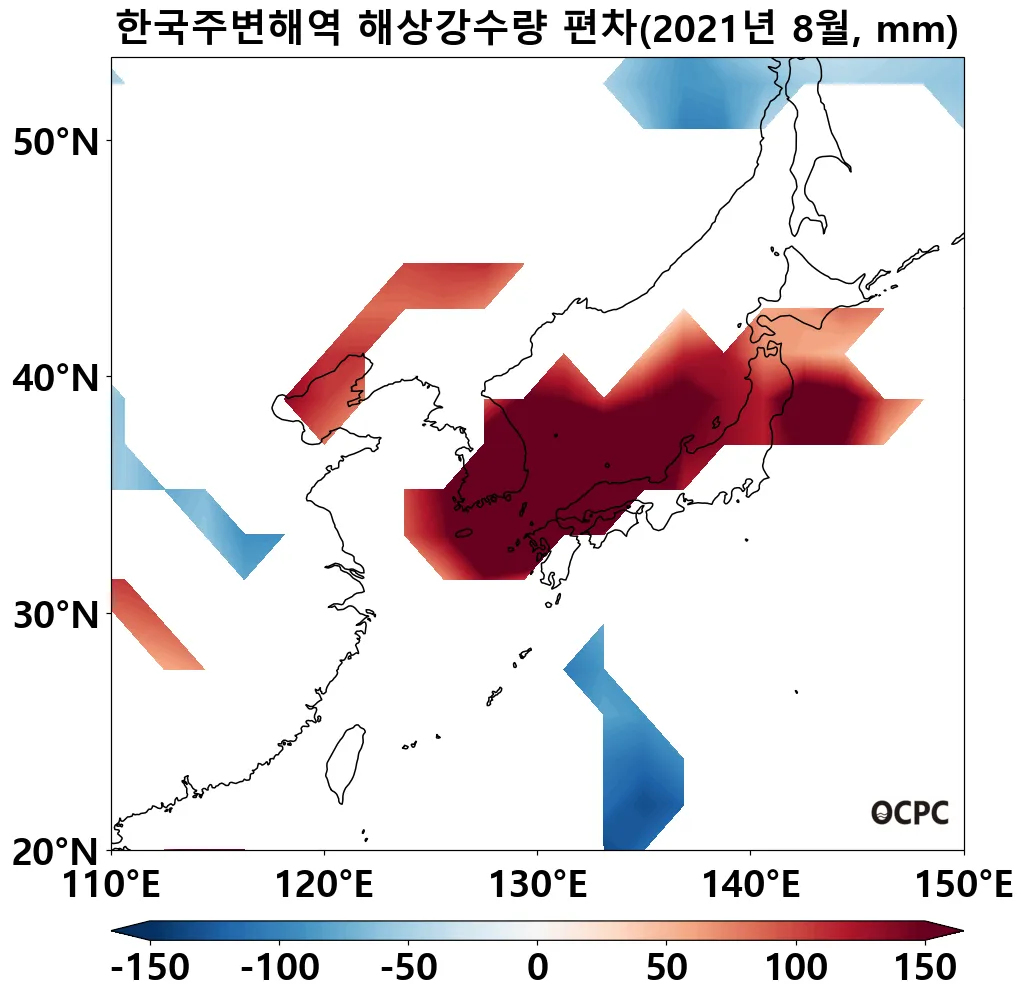 전지구, 한국주변해역, 동중국해의 8월 해상강수량은 평년(90.5mm, 160.3mm, 187.8mm)과 비슷했습니다.