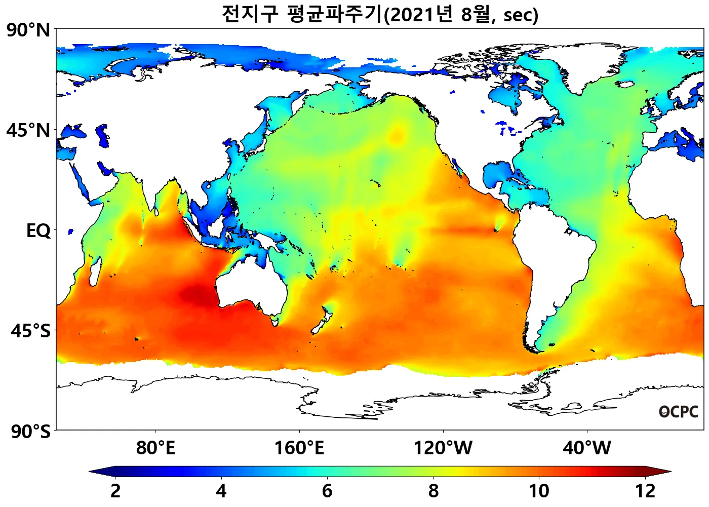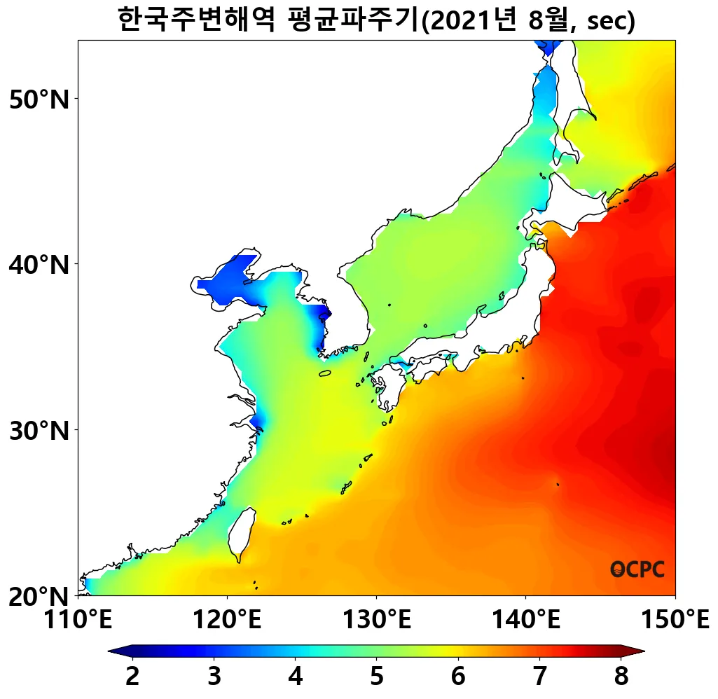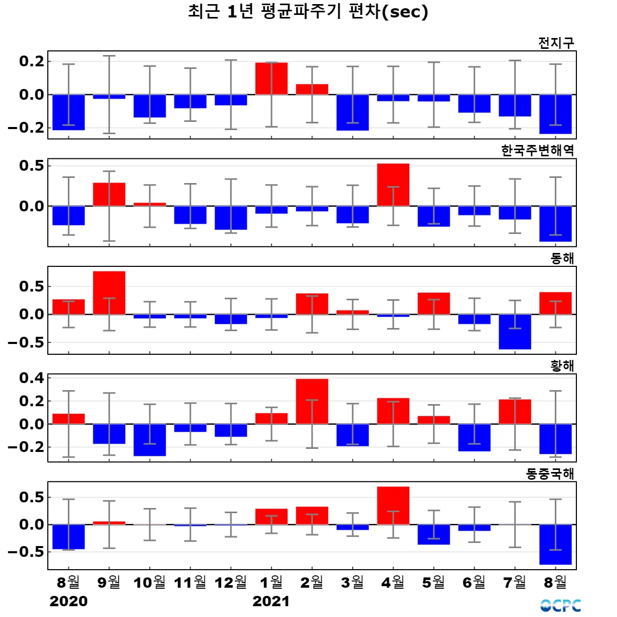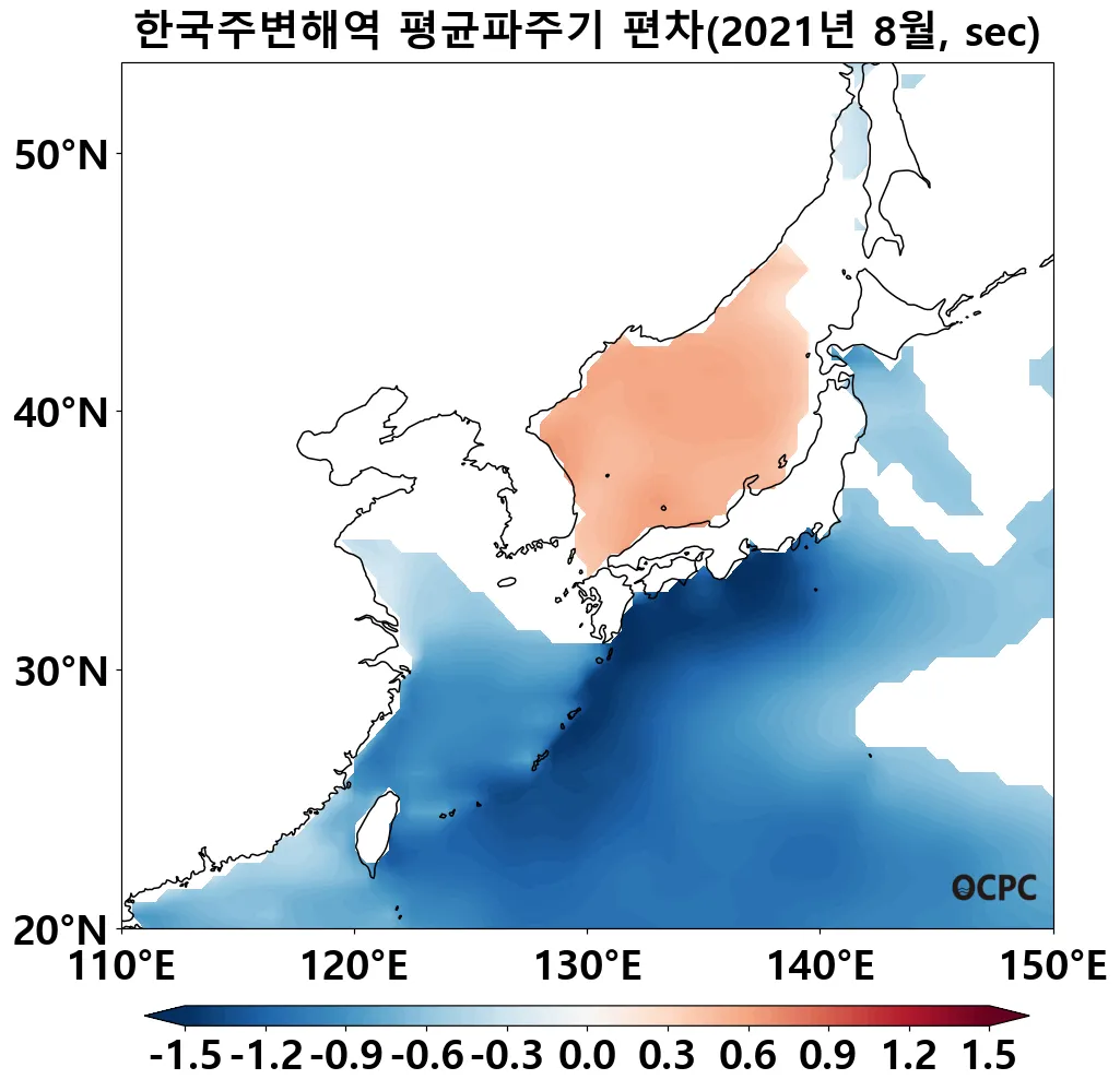 전지구, 한국주변해역 및 동중국해의 평균파주기는 평년보다 각각 0.2초, 0.4초, 0.7초 감소했고, 동해는 평년보다 0.4초 증가했으며, 한국주변해역은 평년과 비슷했습니다.