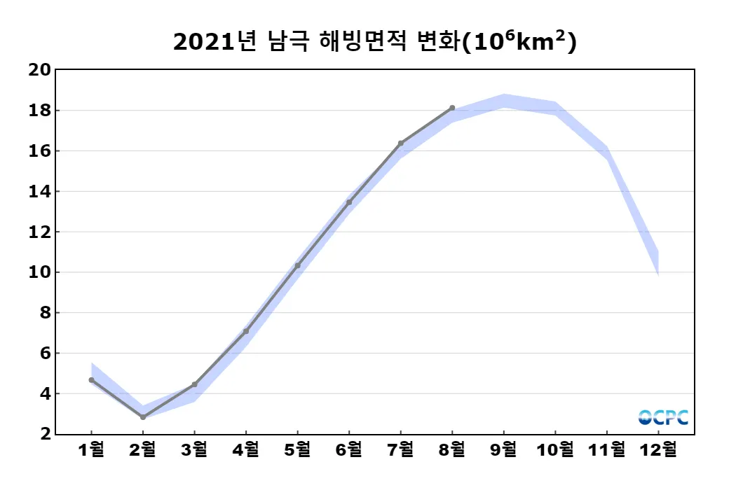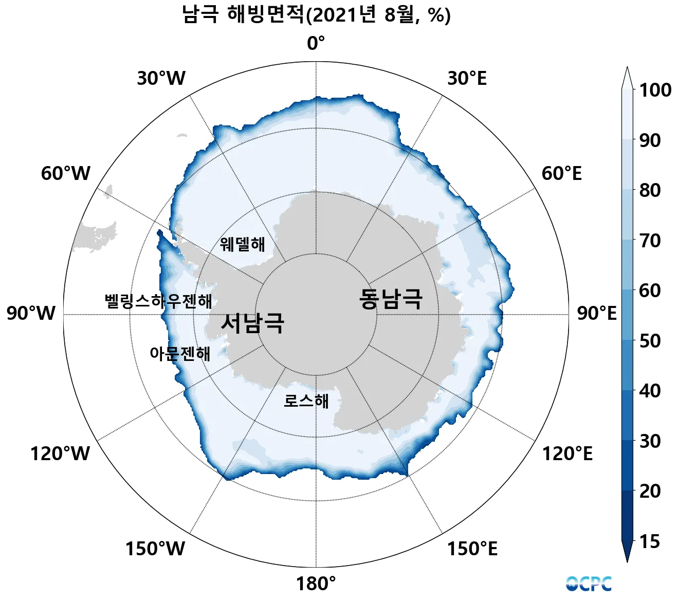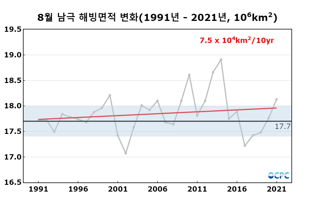 남극 해빙면적은 1,813만km²로 평년(1,772만km²) 대비 2.3% 증가했습니다.