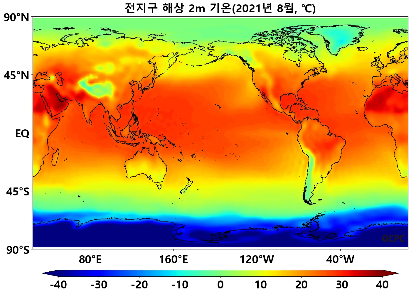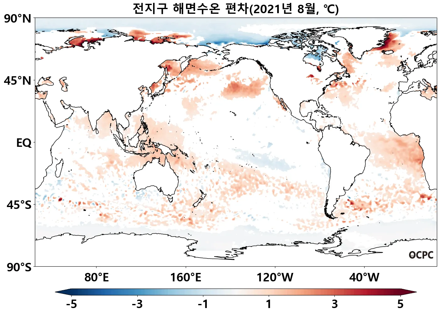 전지구 8월 평균 해면수온은 평년보다 높았으나 한국주변해역은 평년과 비슷했습니다.