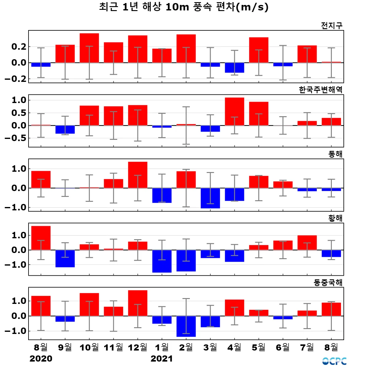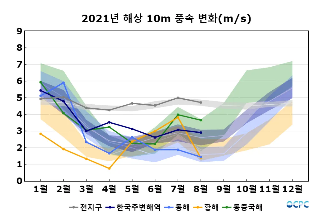 전지구, 한국주변해역, 동해, 황해, 동중국해의 해상풍속은 평년과 비슷했습니다.