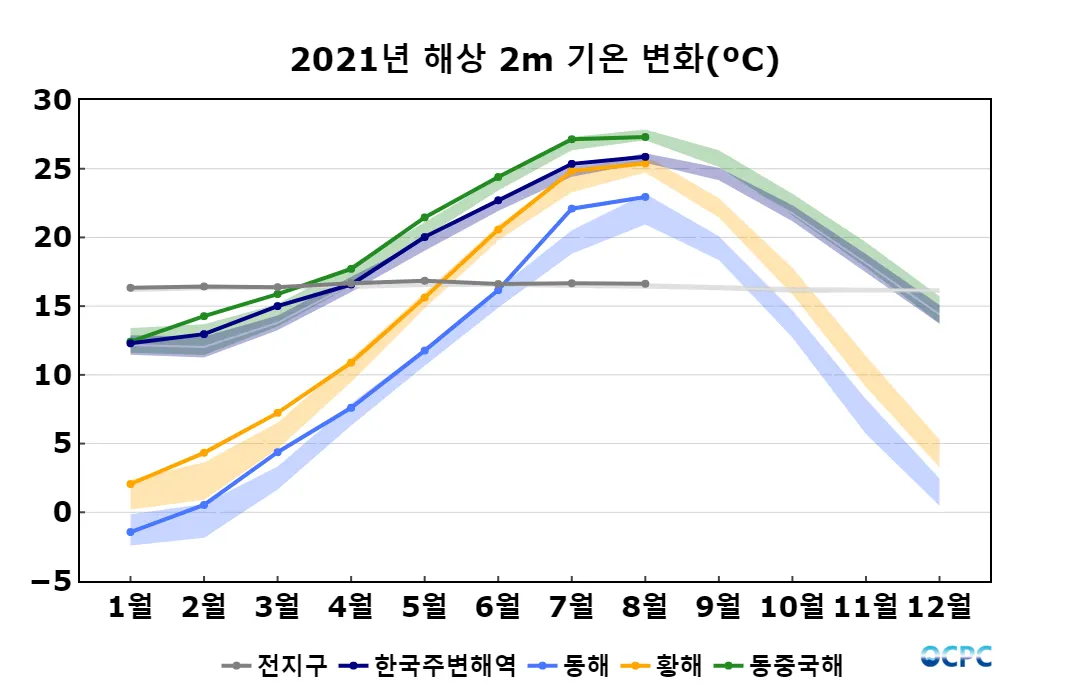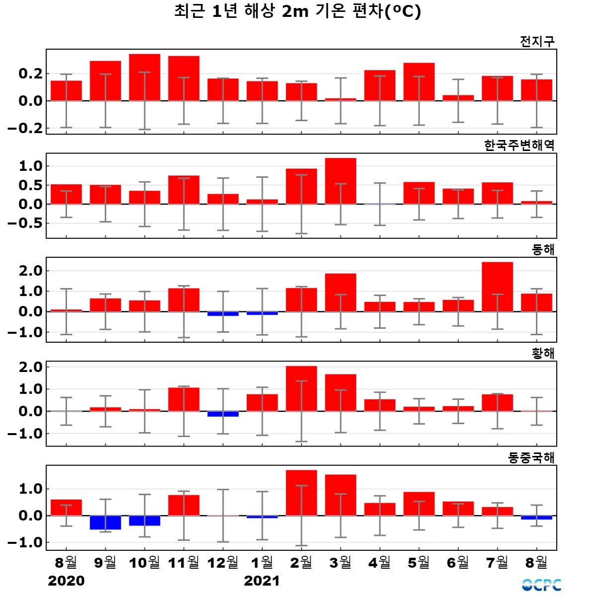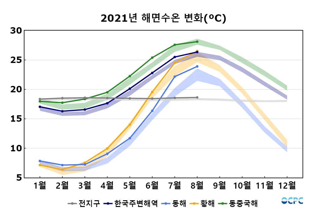 전지구, 한국주변해역, 동해, 황해, 동중국해의 해상기온은 평년과 비슷했습니다.