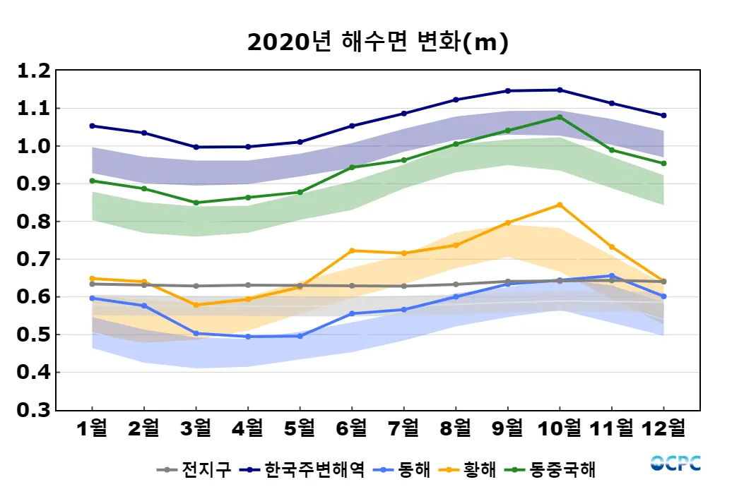 전지구 및 한국주변해역 평균 해수면은 평년보다 높았으며, 특히 황해는 평년보다 12.0cm 높았습니다.