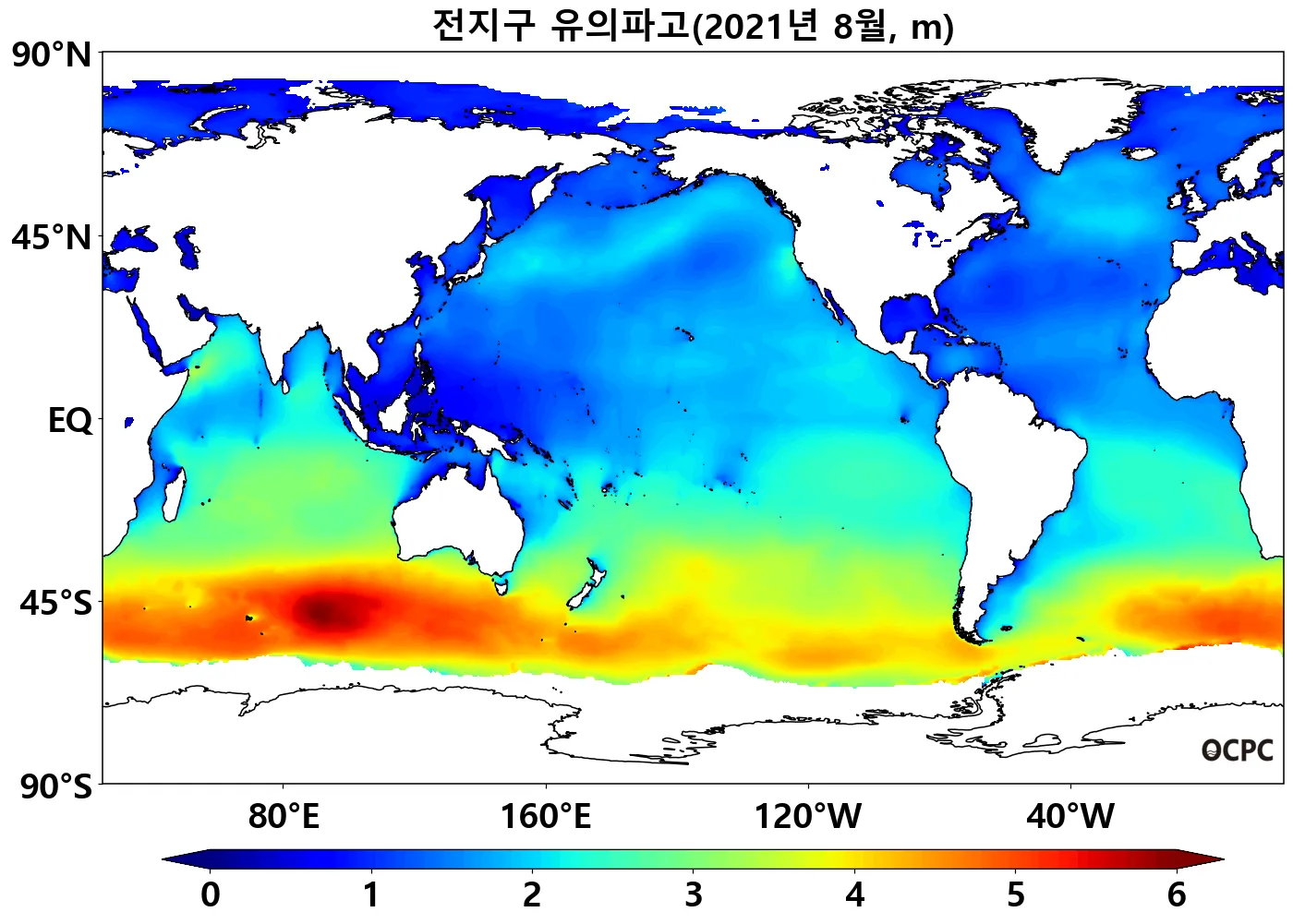 최근 30년 동안 8월의 전지구 유의파고는 10년에 3.0cm씩 낮아지고, 한국주변해역은 1.1cm씩 감소하는 추세입니다.
