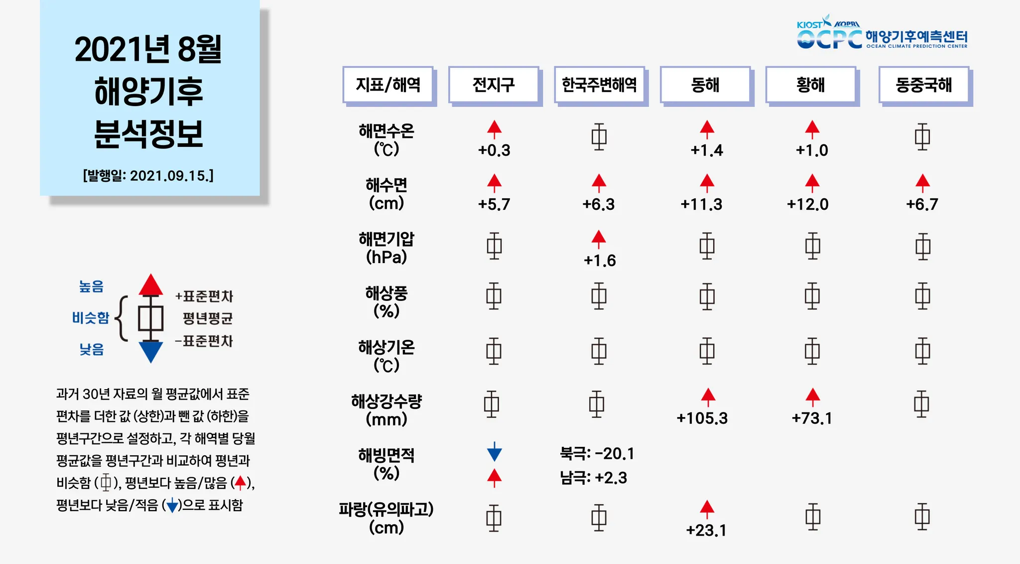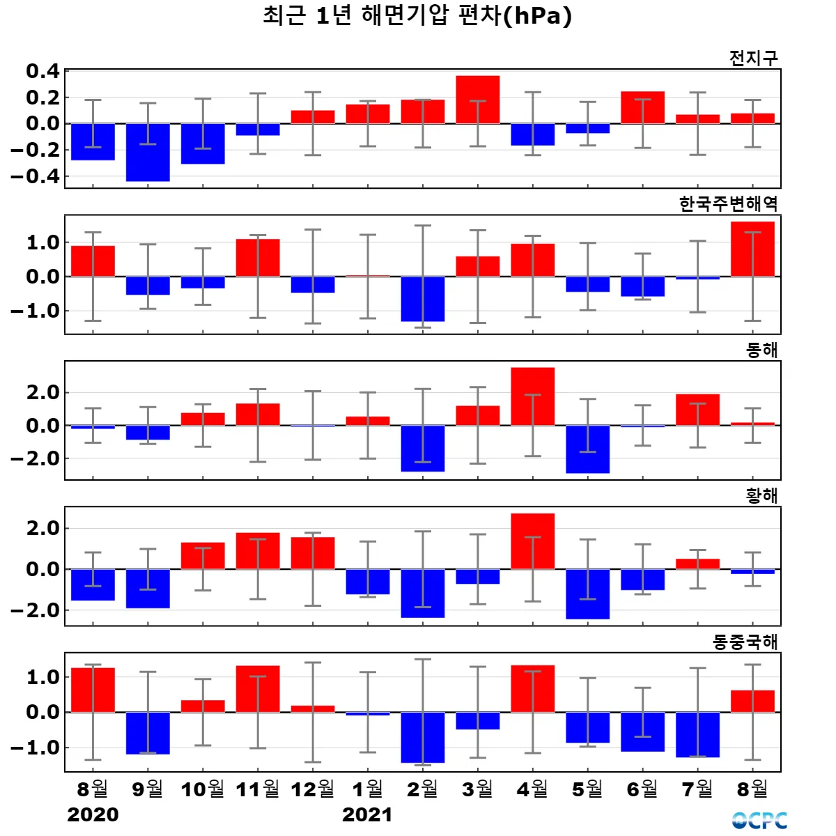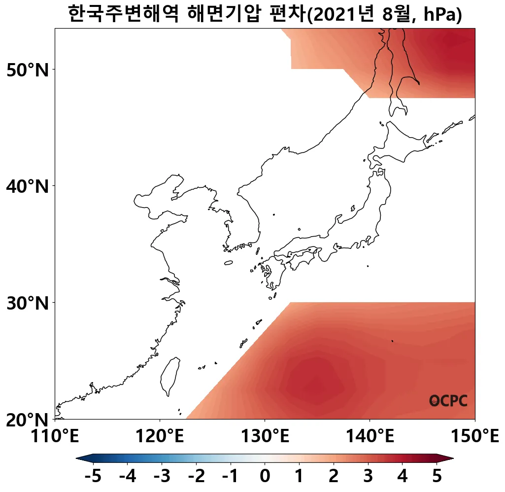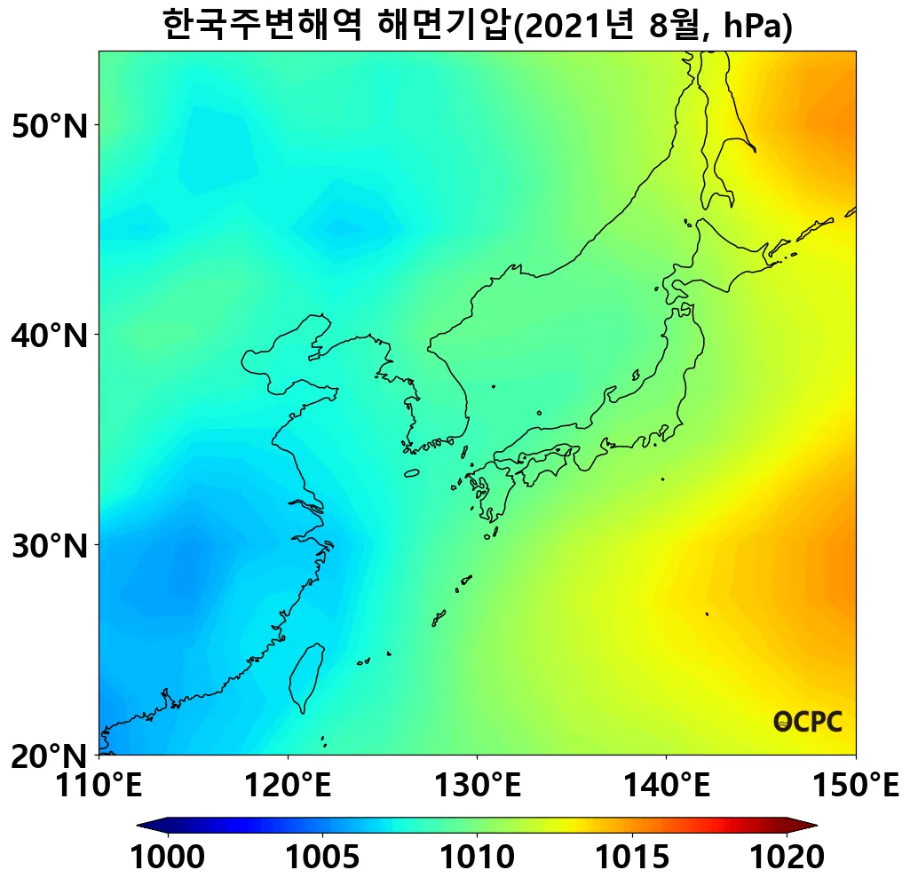 전지구, 동해, 황해, 동중국해의 해면기압은 평년과 비슷했으나 한국주변해역은 1.6hPa 높았습니다.