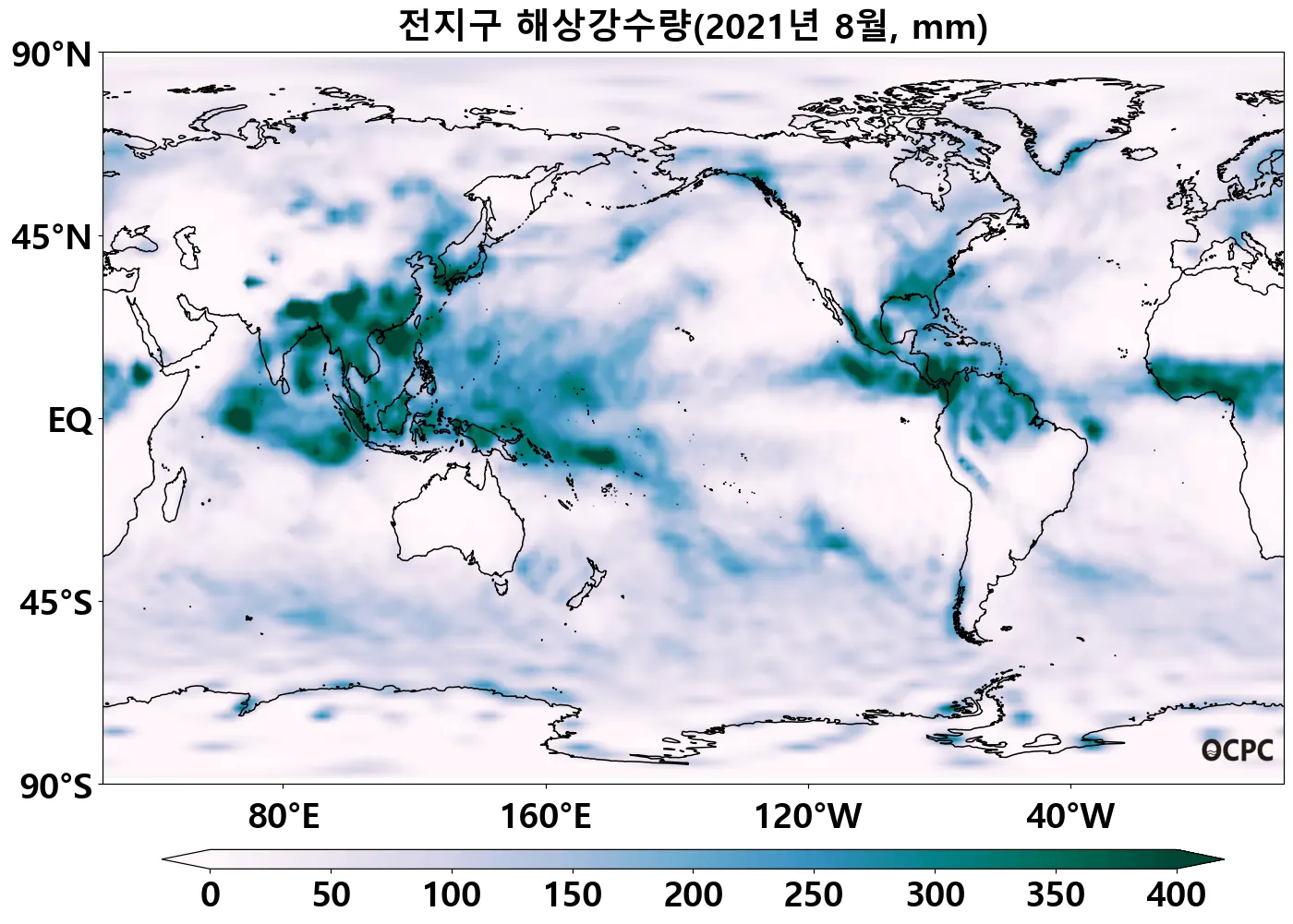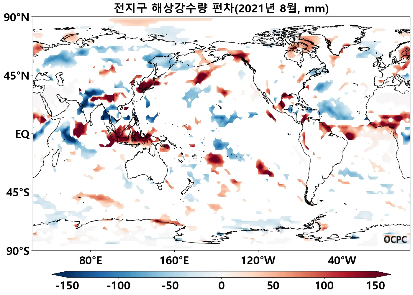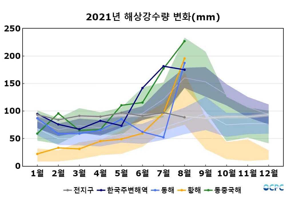 최근 30년 동안 전지구 8월 해상강수량은 10년에 1.0mm씩 감소하는 추세이며, 한국주변해역, 동해, 동중국해는 10년에 11.3~12.2mm씩 증가하는 추세입니다.