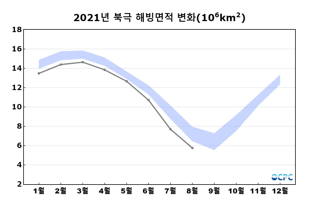 이는 최소 면적을 기록한 2012년보다는 103만km² 늘어난 값이며, 위성관측 기간 중 10번째로 작은 값입니다.