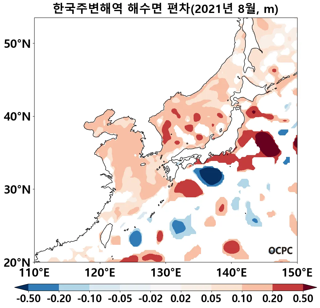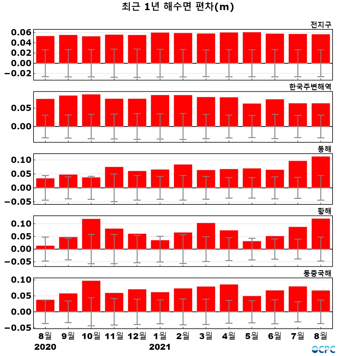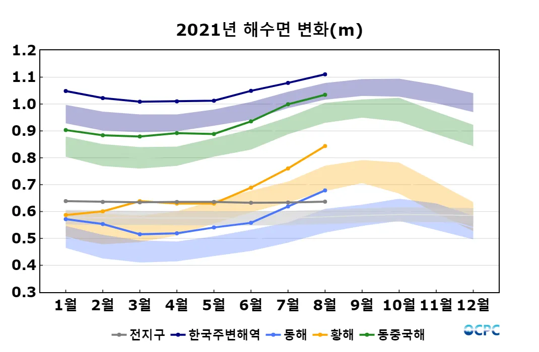 동해, 황해, 동중국해는 평년보다 각각 11.3cm, 12.0cm, 6.7cm 씩 높았으며, 이는 모두 최근 28년(1993~2021) 8월 기록 중 최고 수치입니다.