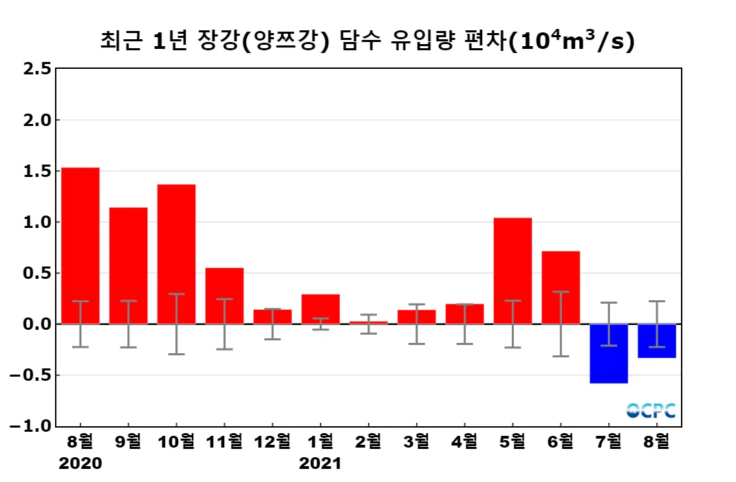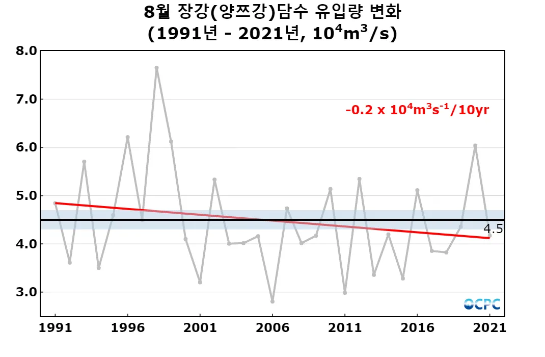 최근 30년 8월 양쯔강 담수 유입량은 10년에 약 2,000m³/s씩 감소하는 추세입니다.
