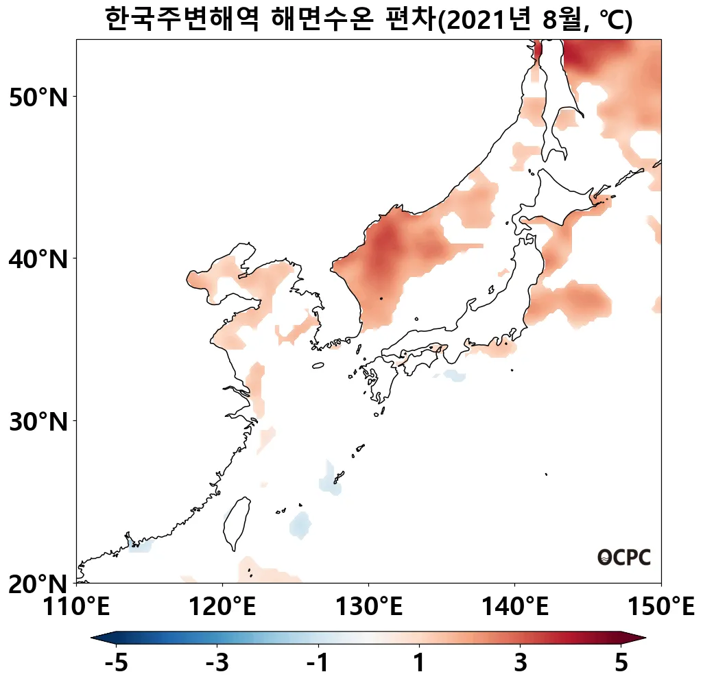 동해는 평년(23.9°C)보다 1.4°C, 황해는 평년(25.5°C)보다 1.0°C 높았으며, 동중국해는 평년(28.1°C) 수준을 유지하였습니다.