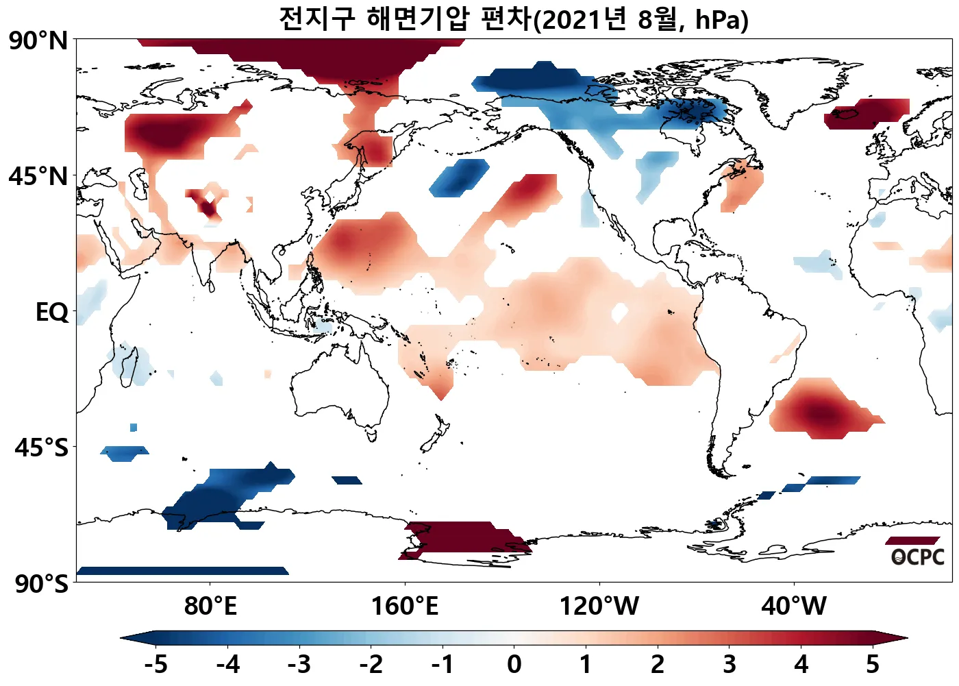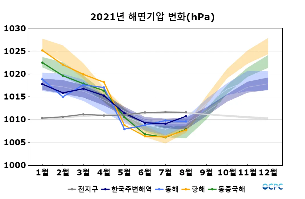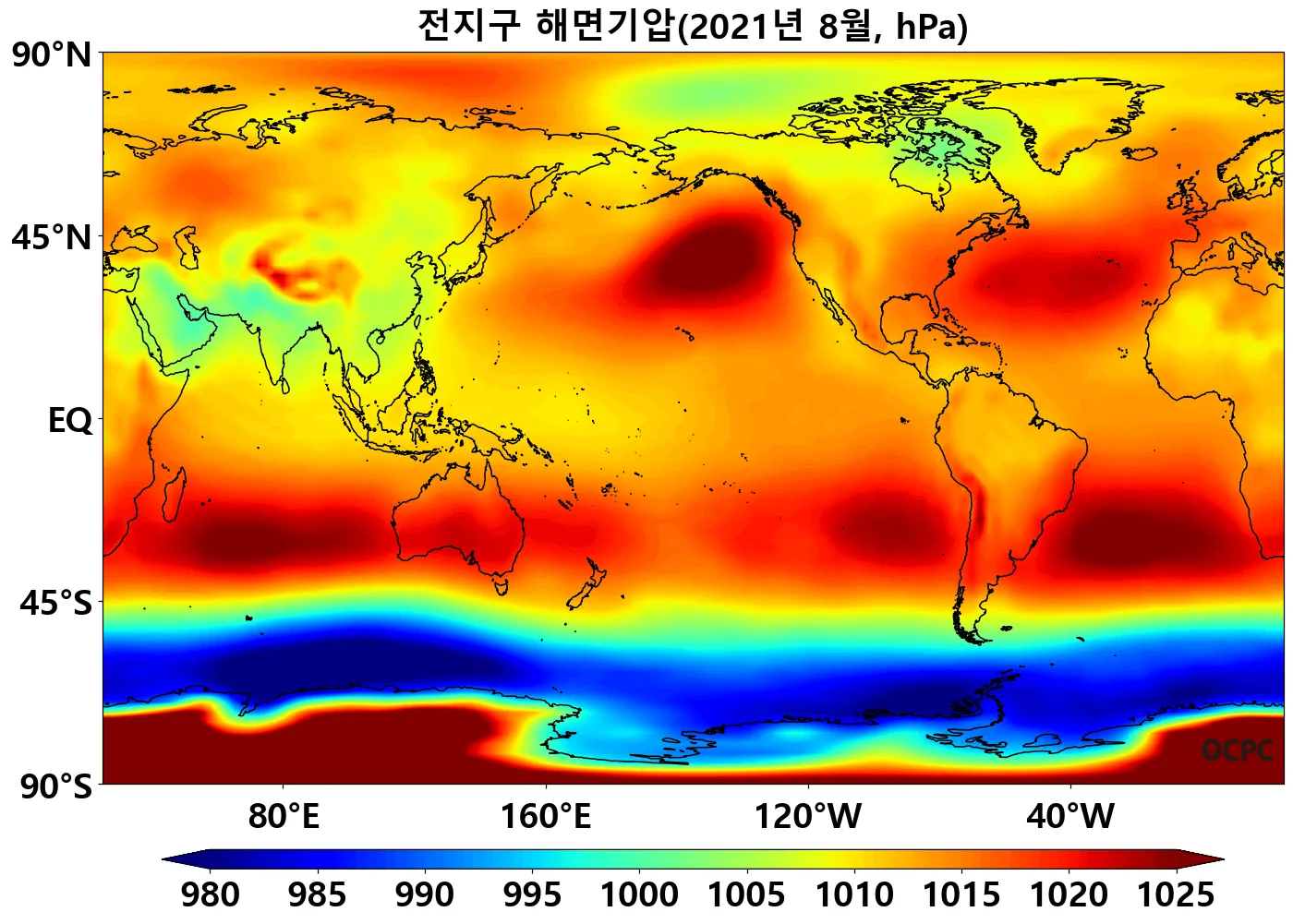 전지구 해면기압은 평년(1011.5hPa)과 비슷했으며, 한국주변해역 해면기압은 평년(1009.1hPa)보다 1.6hPa 높았습니다.