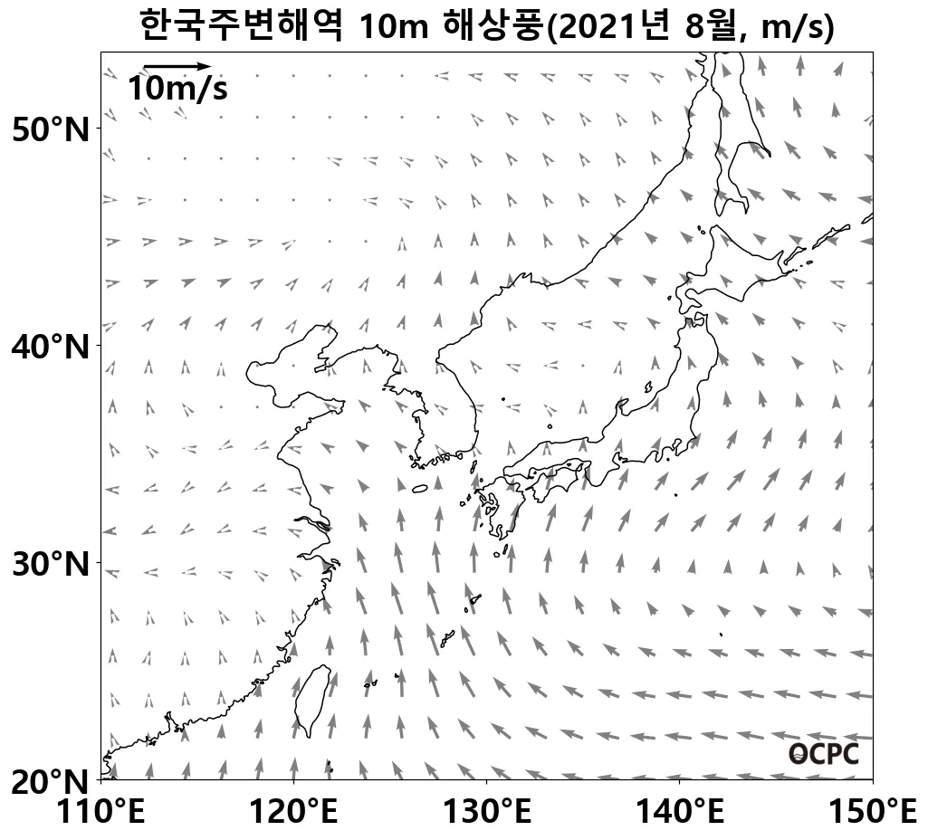 최근 30년 동안 한국주변해역 및 동중국해의 8월 해상풍속은 10년에 0.1m/s씩 증가하는 추세이며, 황해는 10년에 0.1m/s씩 감소하는 추세입니다.