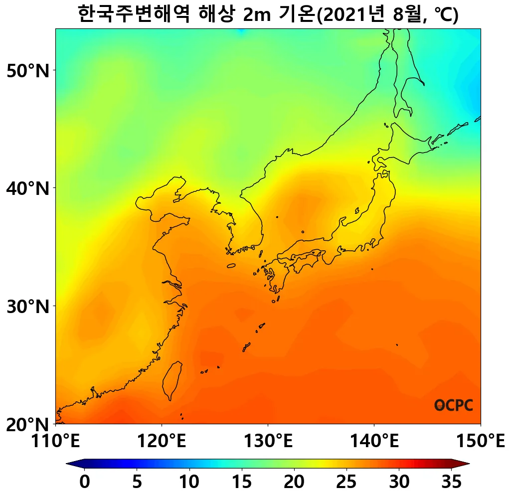 최근 30년 동안 전지구 및 한국주변해역의 8월 해상기온은 10년에 0.2℃씩 증가하는 추세이며, 동해는 0.4.℃씩 증가하는 추세입니다.