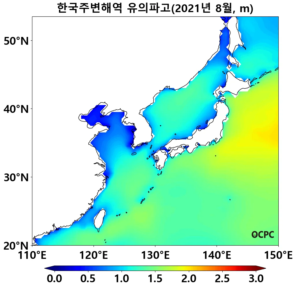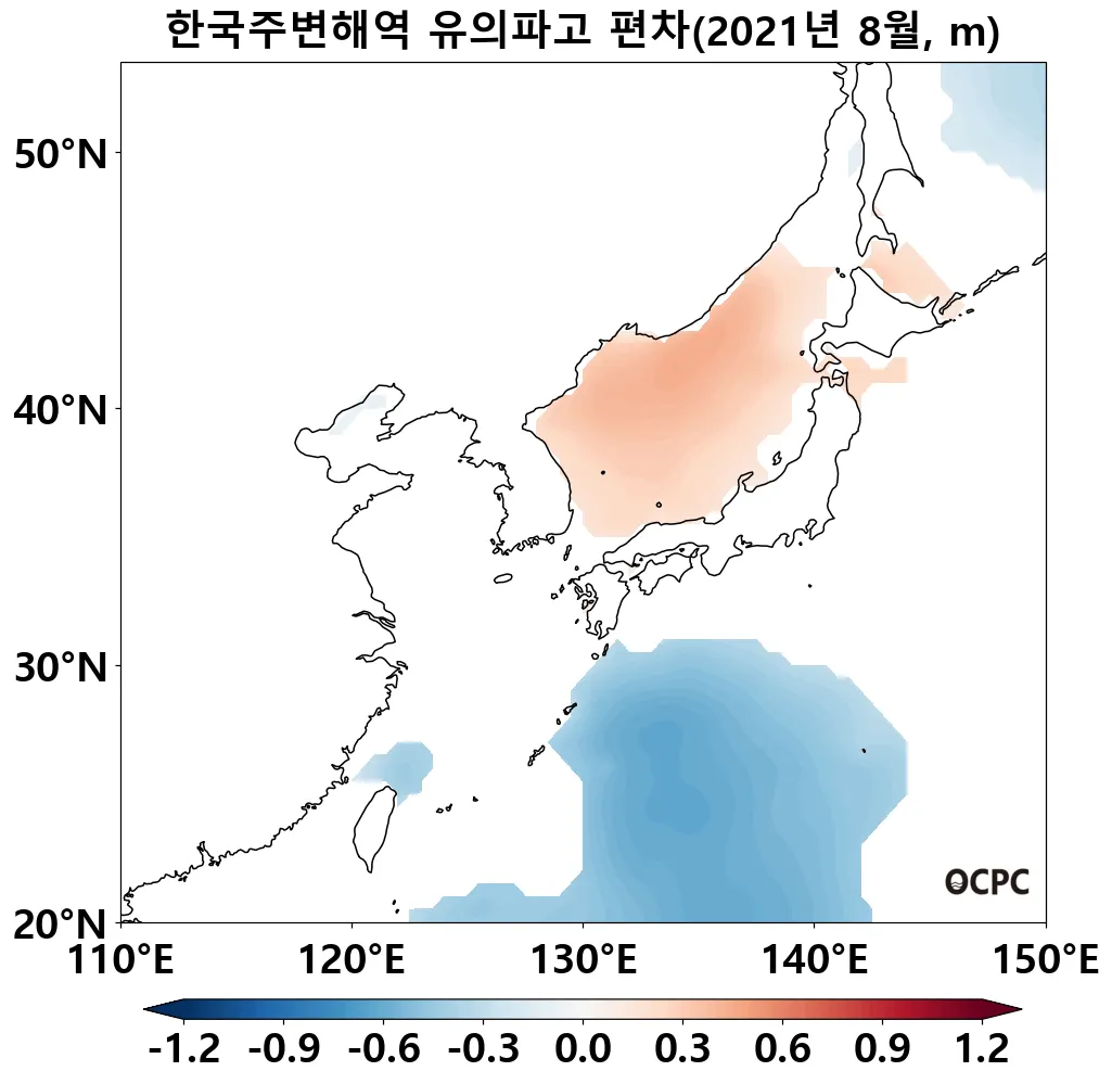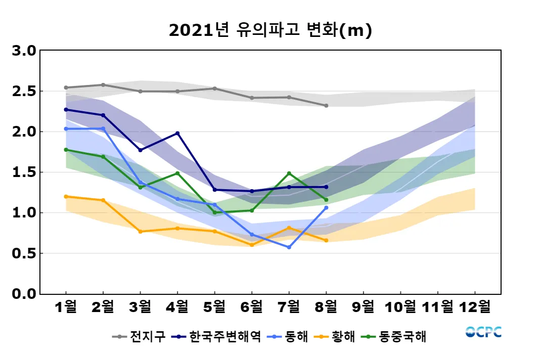 동해의 평균 유의파고는 평년(0.8m)보다 0.2m 높았고, 황해와 동중국해는 평년(0.8m, 1.3m)과 비슷했습니다.