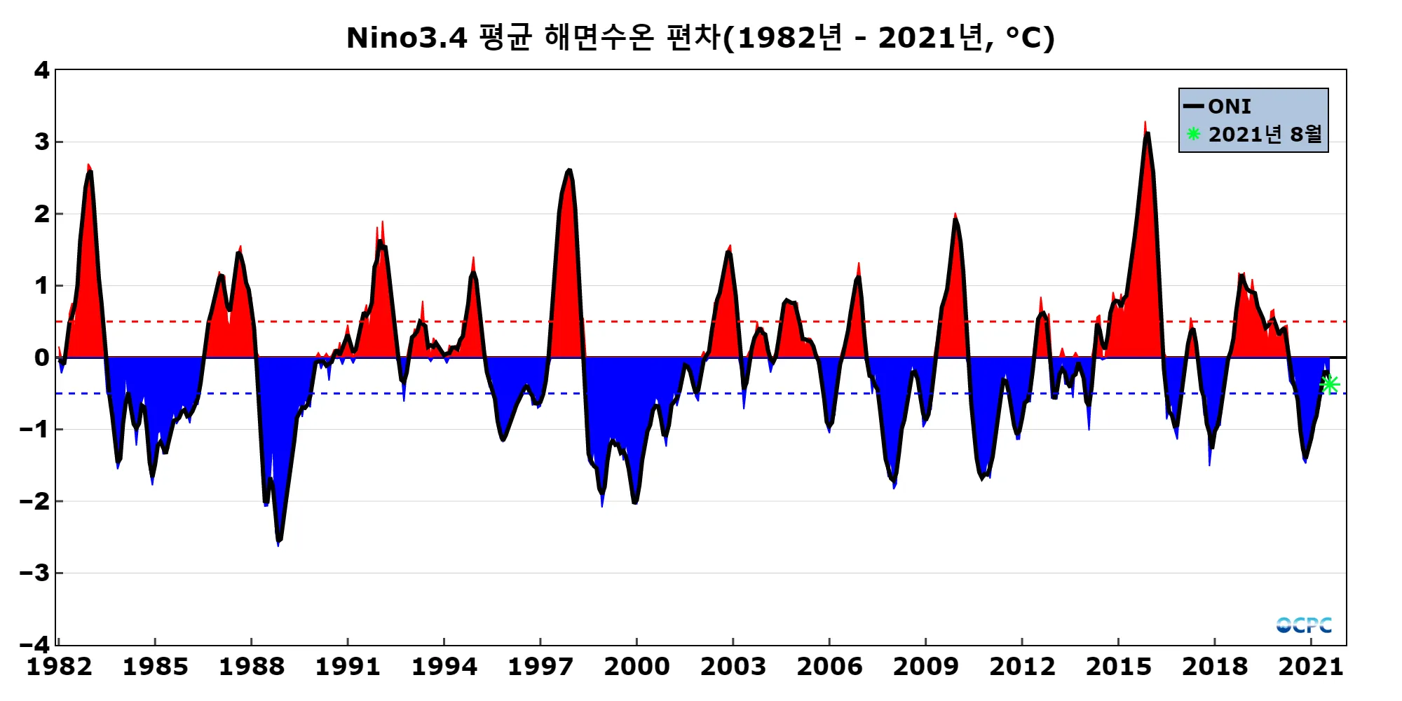 ONI (Ocean Nino Index): 엘니뇨/라니냐 감시구역인 Nino3.4 해역의 월평균 해면수온 편차(채색부분)를 3개월 이동평균하여 나타낸 지수(검정선)로 0.5 보다 크면 엘니뇨, -0.5 보다 작으면 라니냐로 판정합니다.