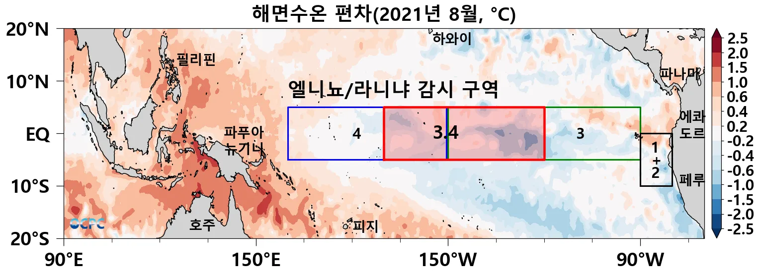 엘니뇨/라니냐 감시구역인 열대태평양 Nino3.4 해역(5°S~5°N, 170°W~120°W)의 8월 평균 해면수온 편차는 평년 범위에 있습니다.