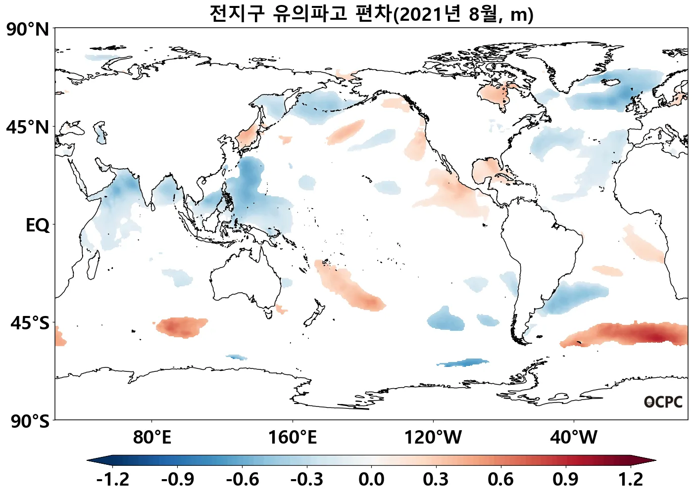 전지구 및 한국주변해역의 평균 유의파고는 평년(2.4m, 1.4m)과 비슷했습니다.
