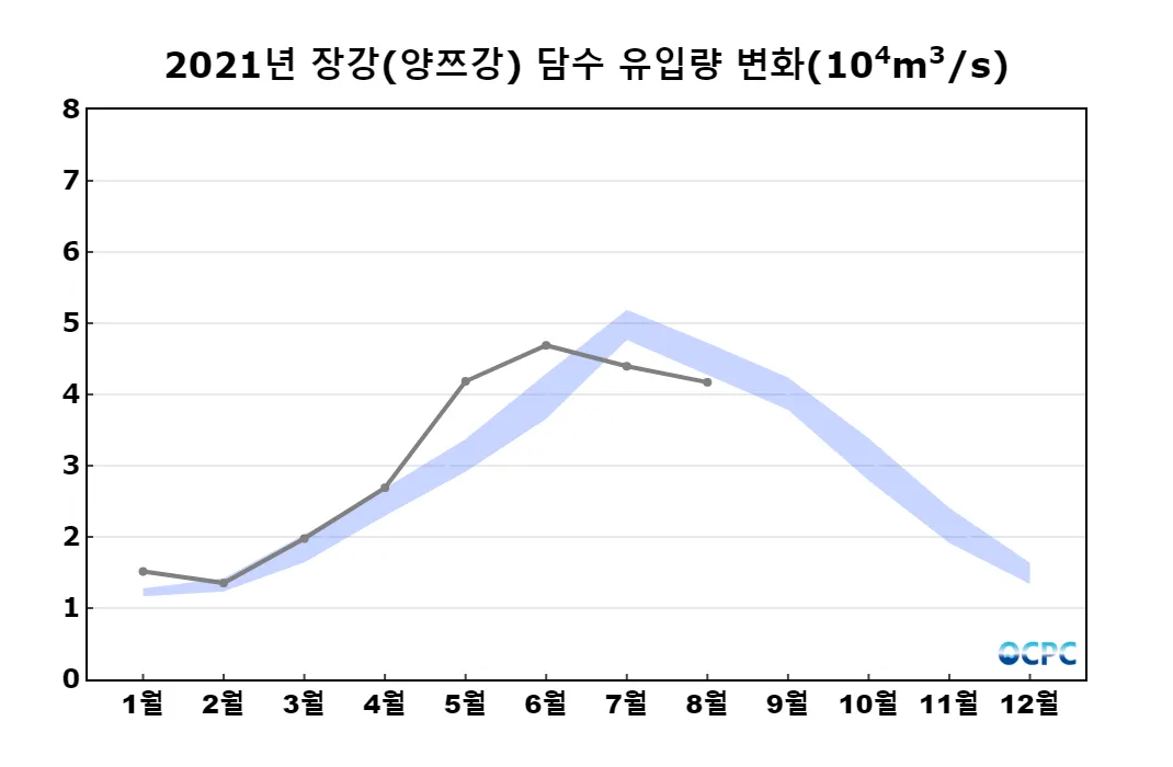 양쯔강(장강)으로부터의 8월 담수 유입량은 평년보다 7.4% 적은 초당 약 4만2천톤이었으며, 이는 작년보다 44.8% 감소한 양입니다.