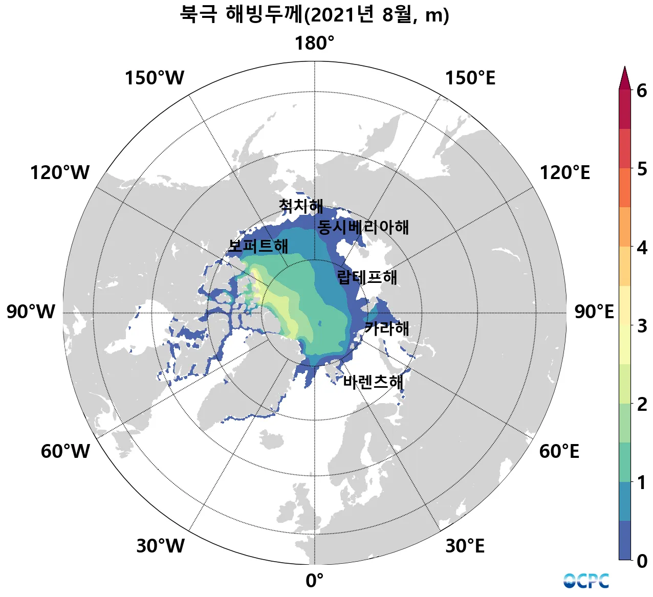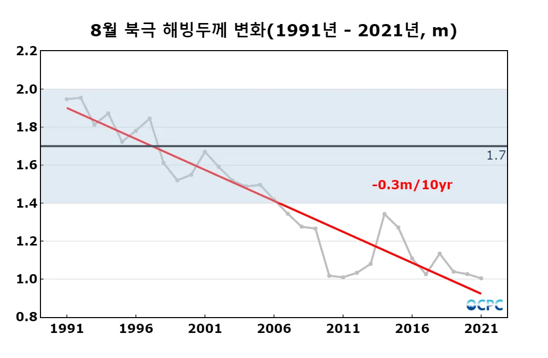 북극 해빙두께는 평년(1.7m)보다 약 0.7m(41.2%) 얇았으며, 최근 30년 동안 10년에 약 0.3m씩 얇아지는 추세입니다.