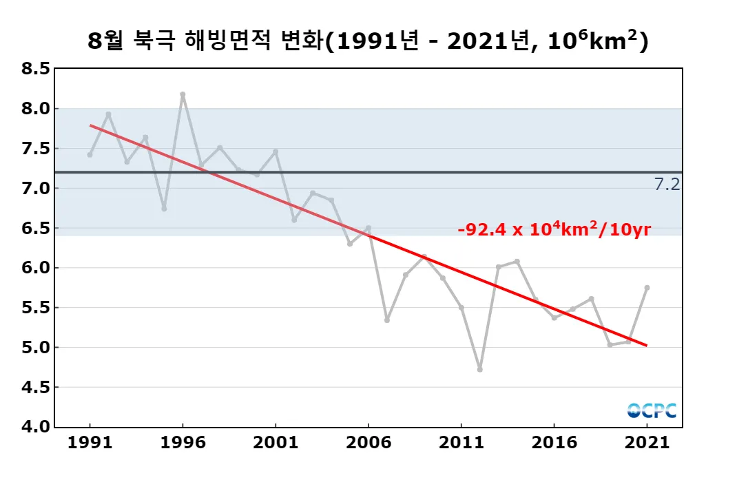 최근 30년 동안 8월 북극 해빙면적의 경향은 10년에 92만km²씩 감소하는 추세입니다.