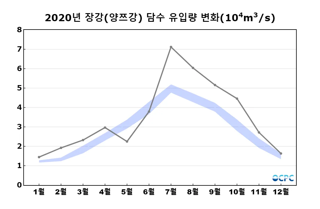 중국 양쯔강(장강)으로부터의 담수 유입량은 평년보다 7.4% 감소하였습니다.
