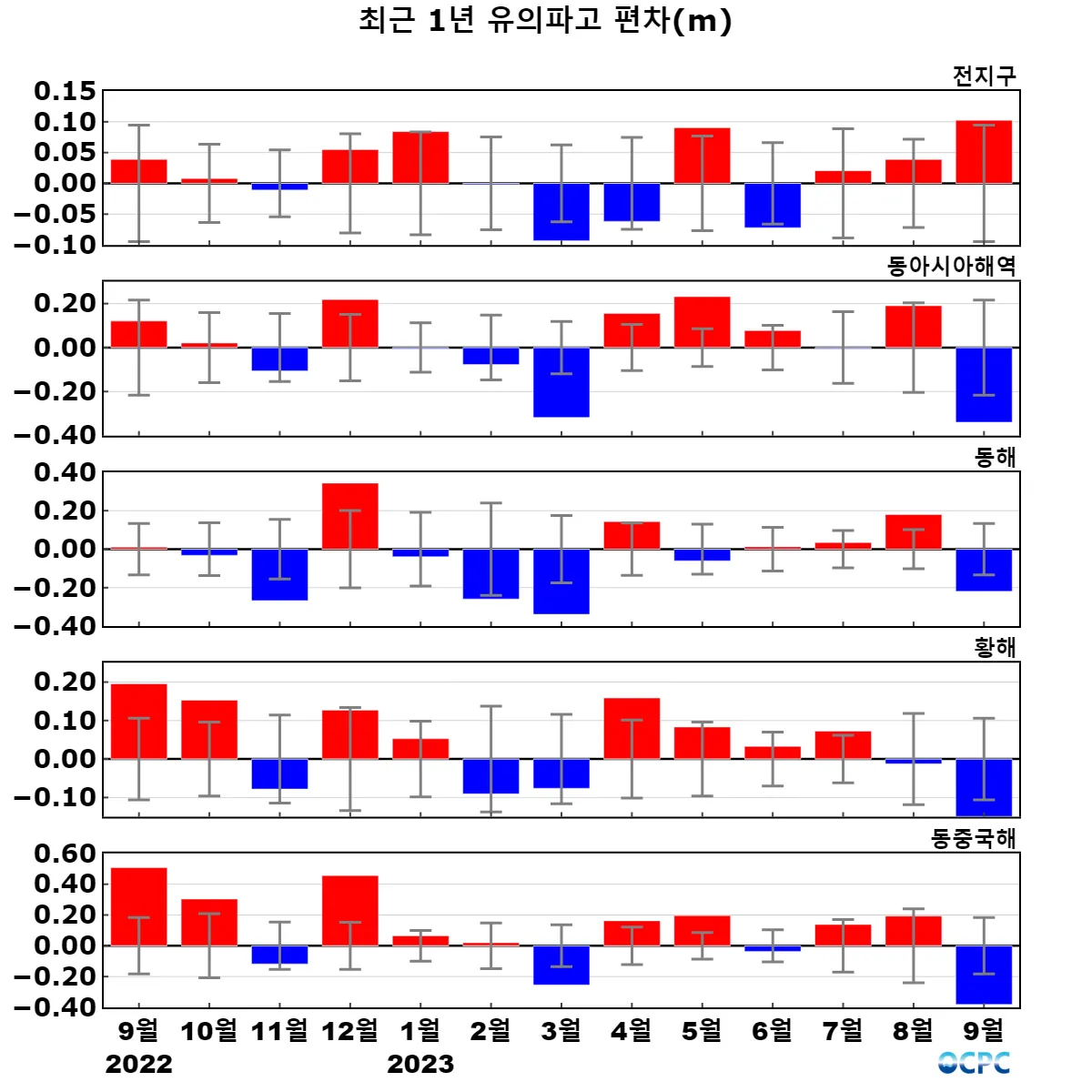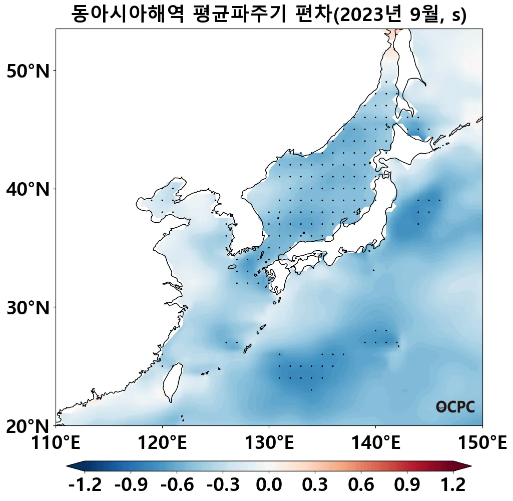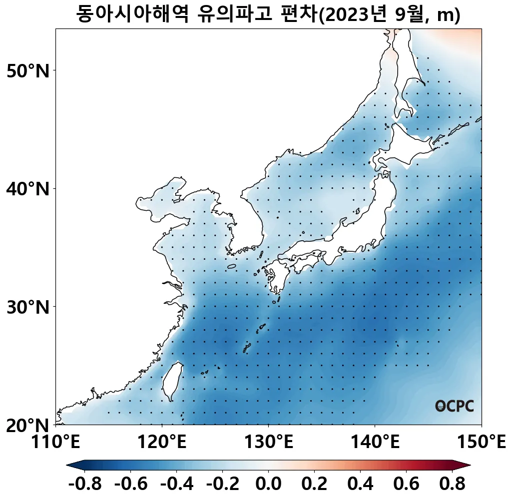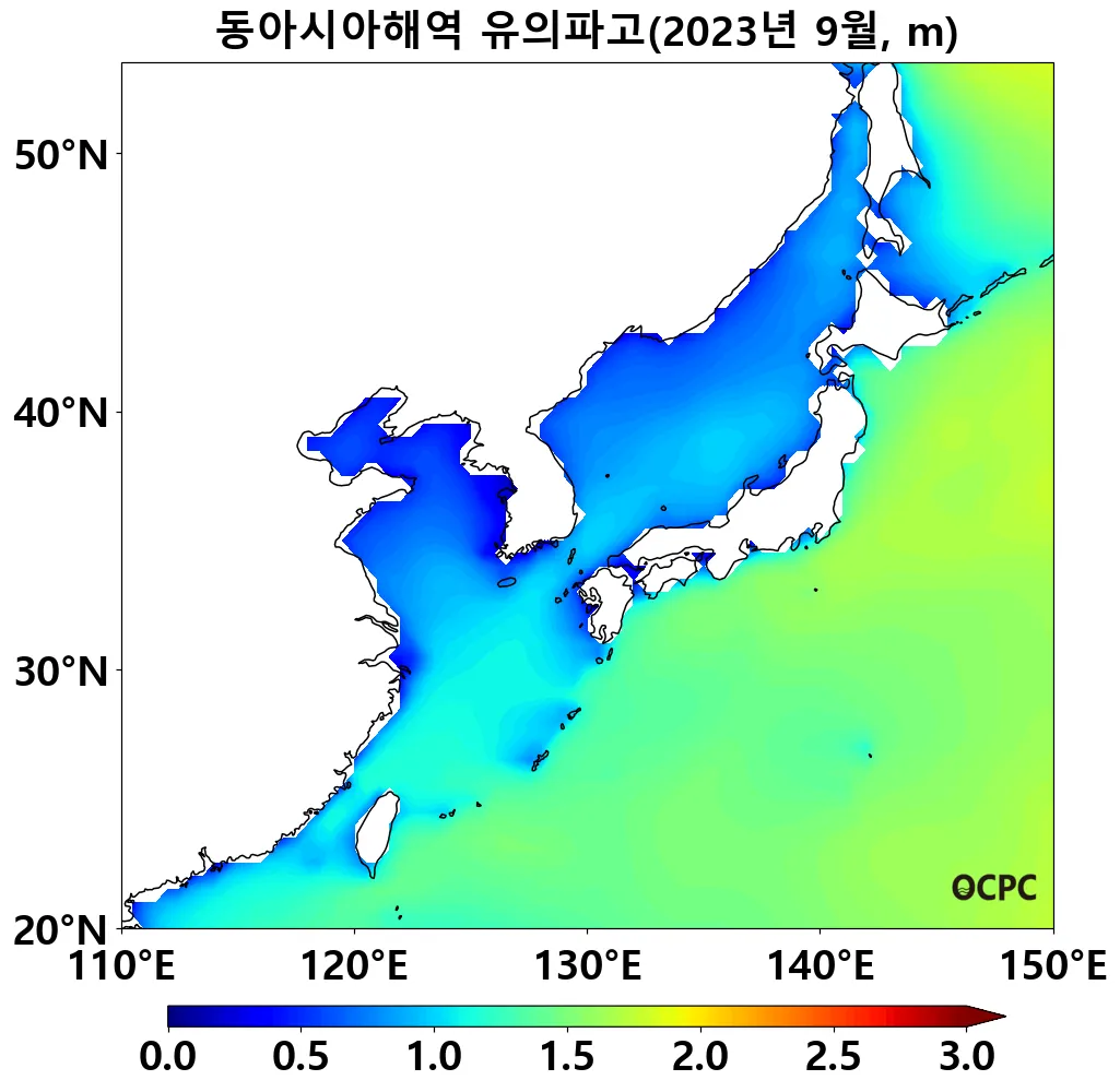 동해, 황해, 동중국해의 평균 유의파고는 평년(1.0±0.1m, 0.8±0.1m, 1.4±0.2m)보다 각각 0.2m, 0.2m, 0.4m씩 감소했으며, 동중국해는 1993~2023년(9월) 중 가장 낮았습니다.