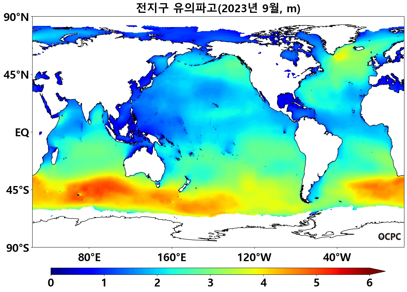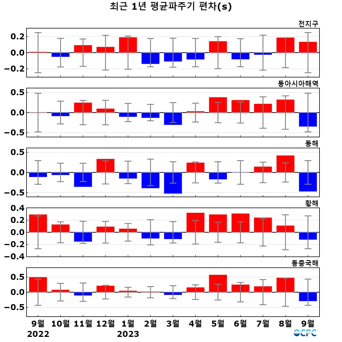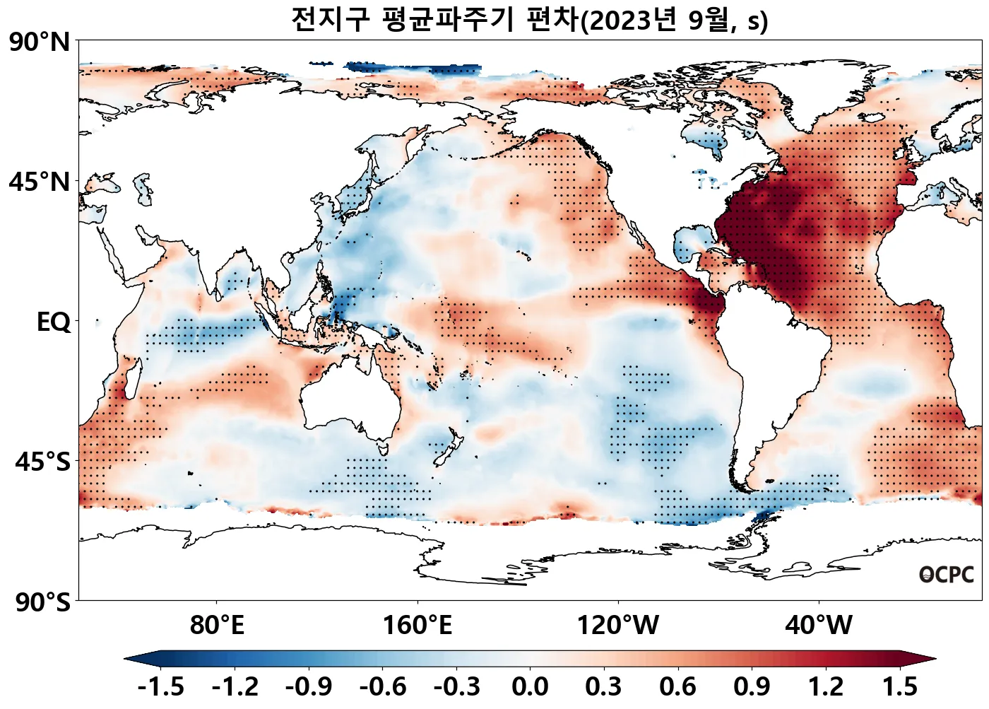 동해, 황해, 동중국해의 평균 유의파고는 평년(1.0±0.1m, 0.8±0.1m, 1.4±0.2m)보다 각각 0.2m, 0.2m, 0.4m씩 감소했으며, 동중국해는 1993~2023년(9월) 중 가장 낮았습니다.
