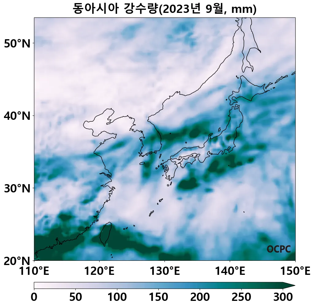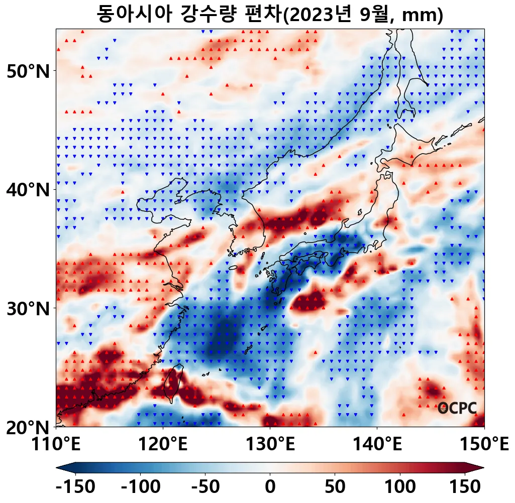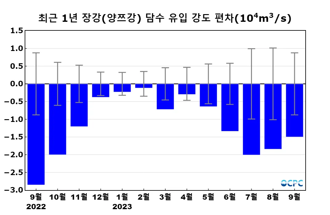 9월 한 달 동안 동중국해로 유입된 담수량으로 환산하면, 65.3기가톤(1Gt=10⁹m³=1km³)으로 평년(104.0±22.7기가톤)보다 38.8기가톤 감소했습니다.