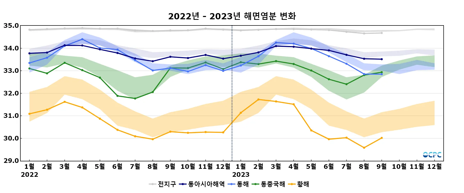 동중국해 해면염분은 자료기간 평균(33.0±0.3)과 비슷했으며, 동해와 황해 해면염분은 자료기간 평균(33.1±0.1, 30.0±0.4)보다 각각 0.3, 0.7 낮았습니다.