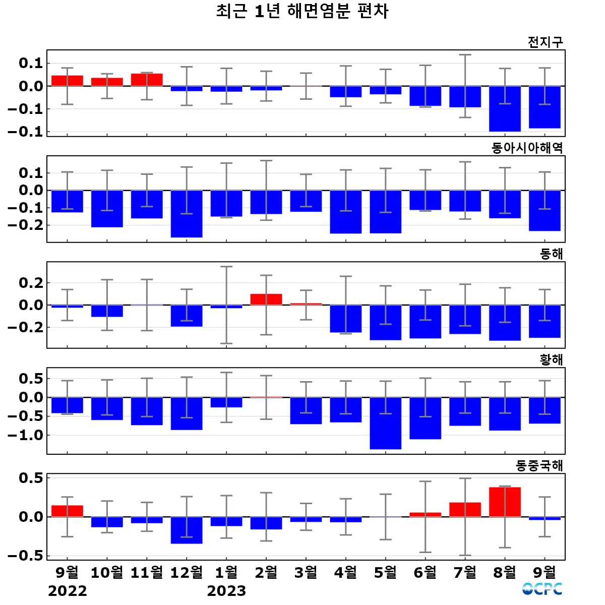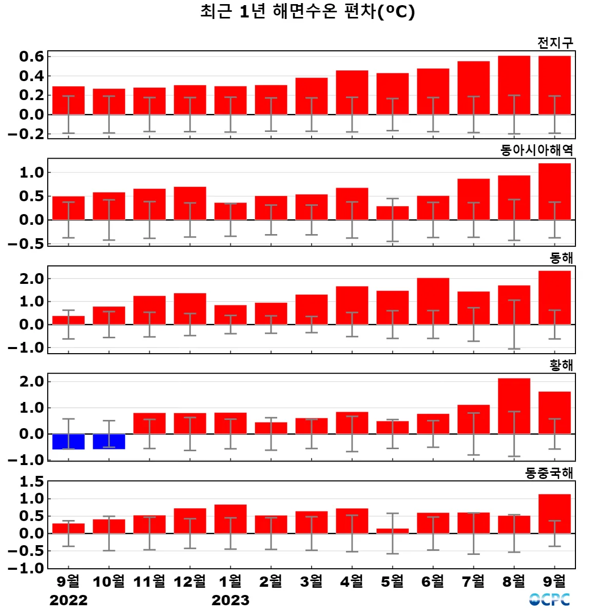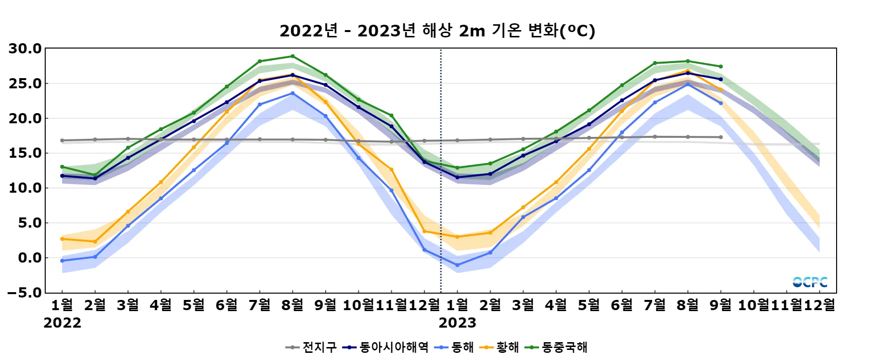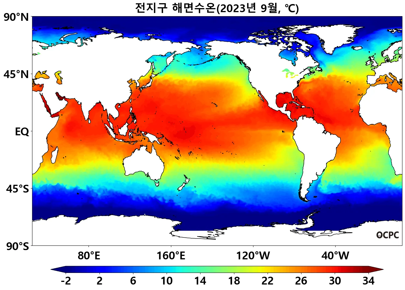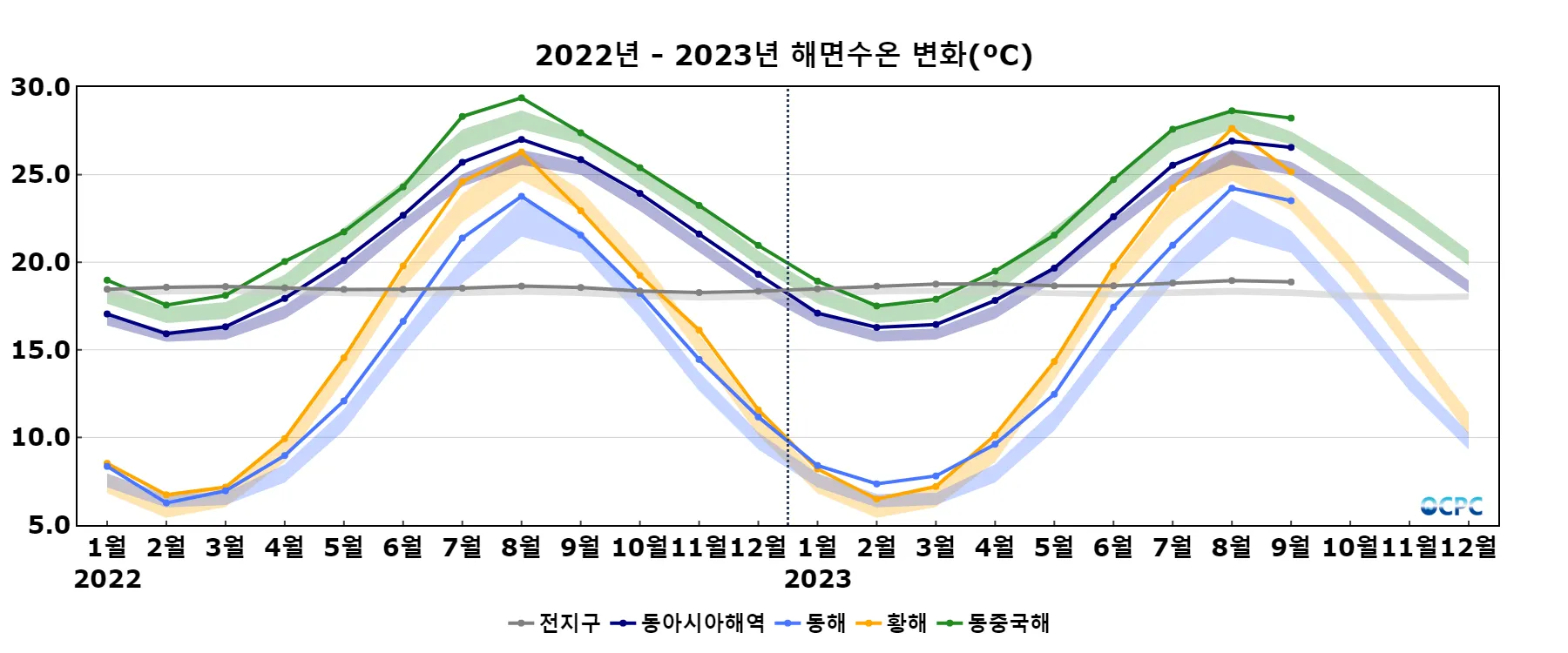 동해와 황해, 동중국해는 평년(21.2±0.6°C, 23.5±0.6°C, 27.1±0.4°C)보다 각각 2.3°C, 1.6°C, 1.1°C 높아 1982~2023년(9월) 중 상위 1위를 기록했습니다.