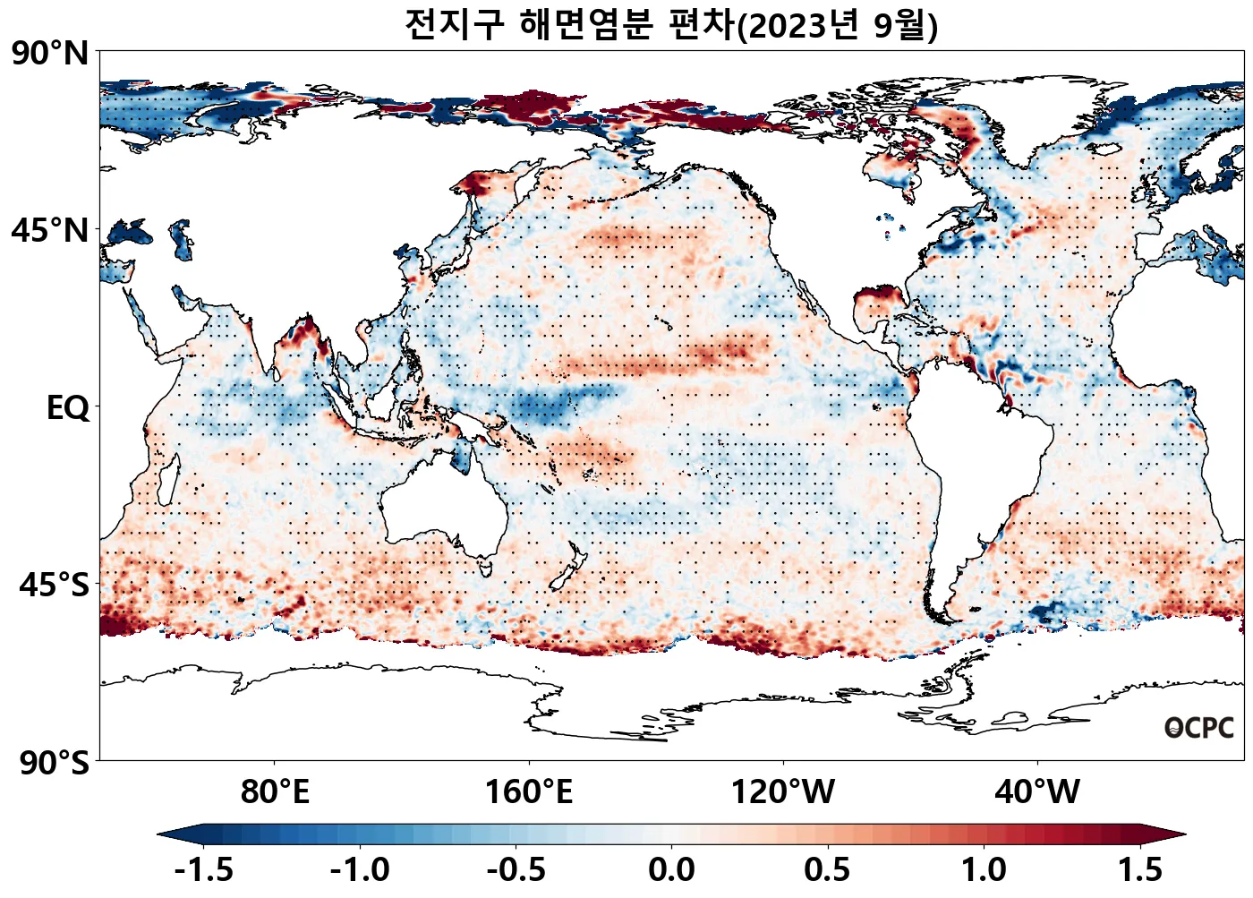 인공위성(SMAP)을 이용한 해면염분 추정 자료는 2015년 4월부터 활용가능하나 기간이 짧고 다른 자료에 비해서 불확실성이 큽니다. 2023년부터는 8년 정도의 자료가 확보되는 시점이어서 기간 평균 대비 월별 편차를 시범적으로 제공하오니 참고하시기 바랍니다.