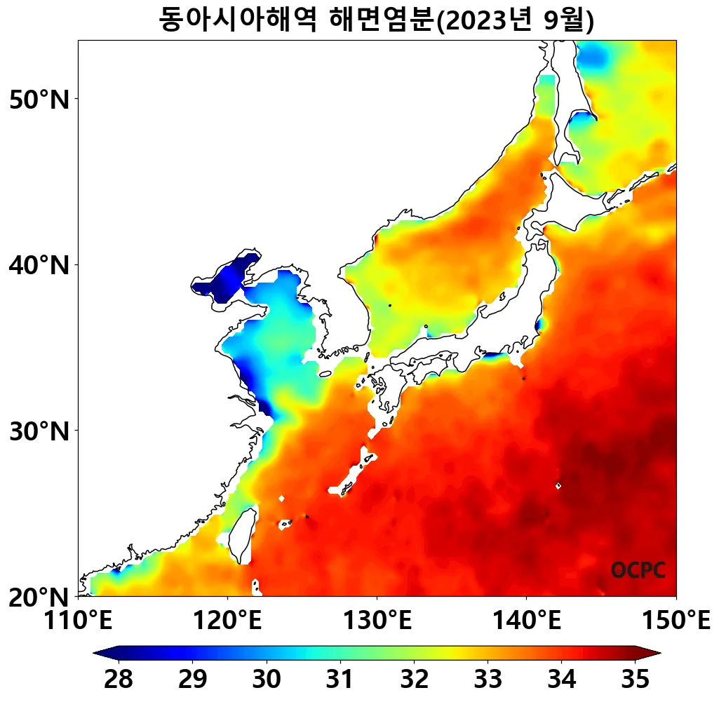 평년보다 적은 담수 유입량으로 인해 장강 하구역(122~123°E, 30~32°N) 해면염분은 자료기간 평균보다 높은 것으로 추정됩니다.