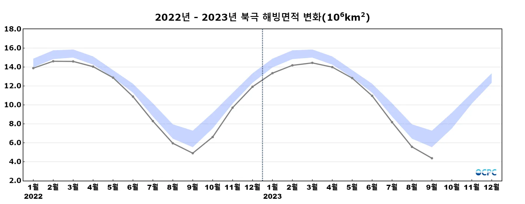9월 북극 해빙면적은 437만km²로 평년(641만±87만km²)보다 204만km²(31.8%) 작았습니다.