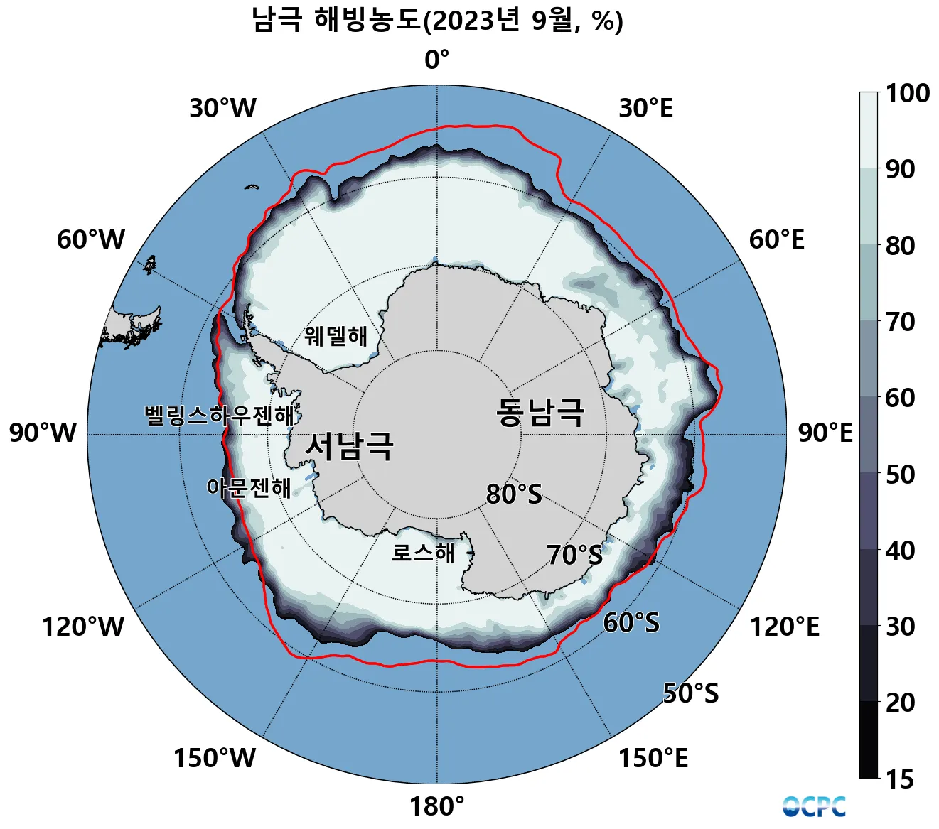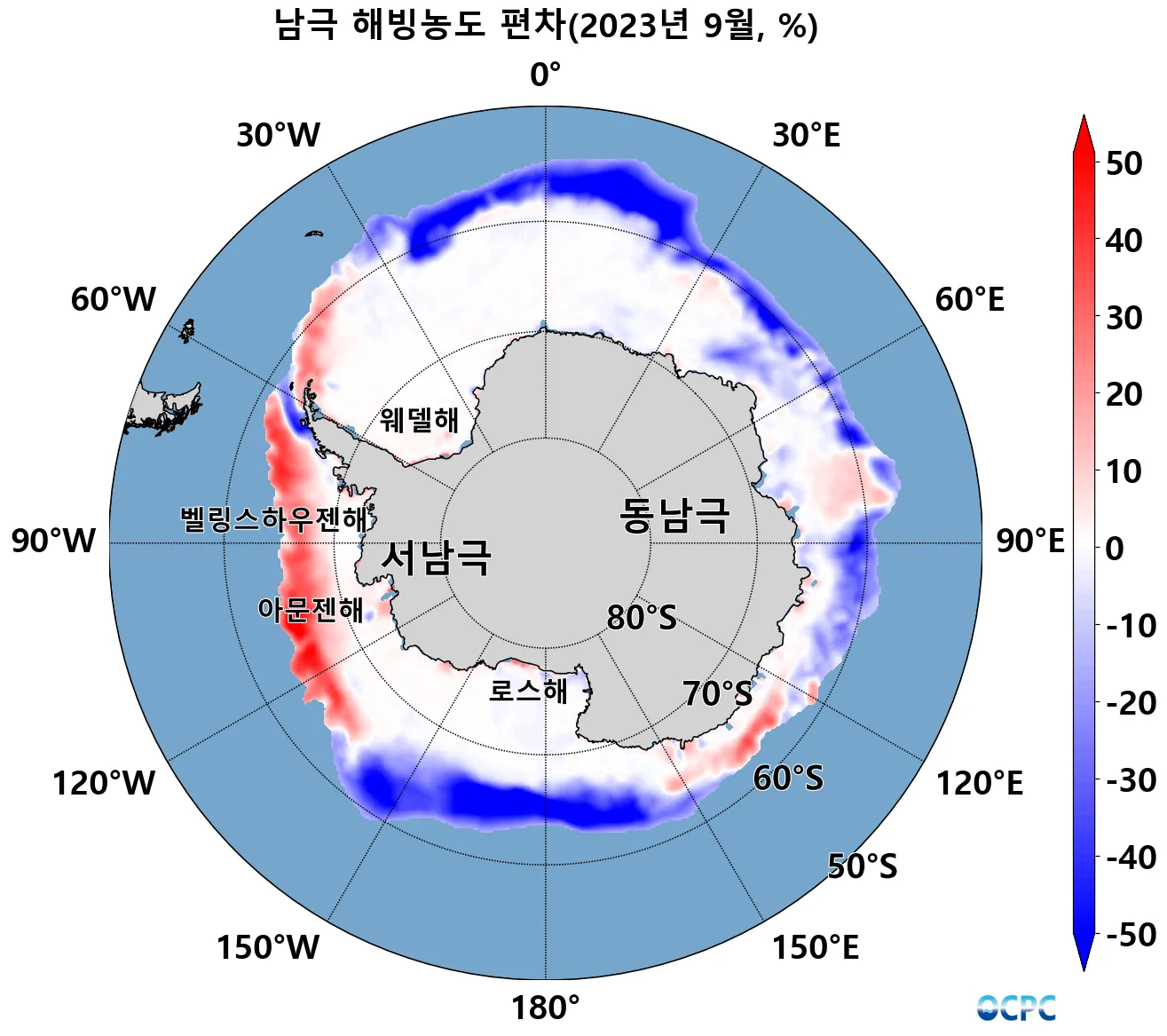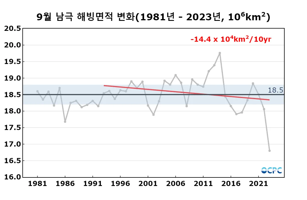 동태평양의 엘니뇨 발달에 따라 저위도의 따뜻한 해류의 유입으로 아문젠해와 벨링스하우젠해를 제외한 대부분의 해역에서 평년 대비 해빙면적이 감소했으며, 1993~2023년 동안 9월 남극 해빙면적은 10년에 14.4만km²씩 감소하는 추세입니다.