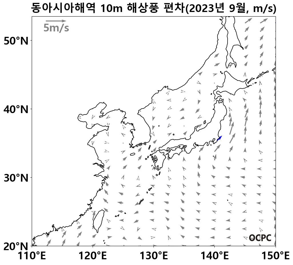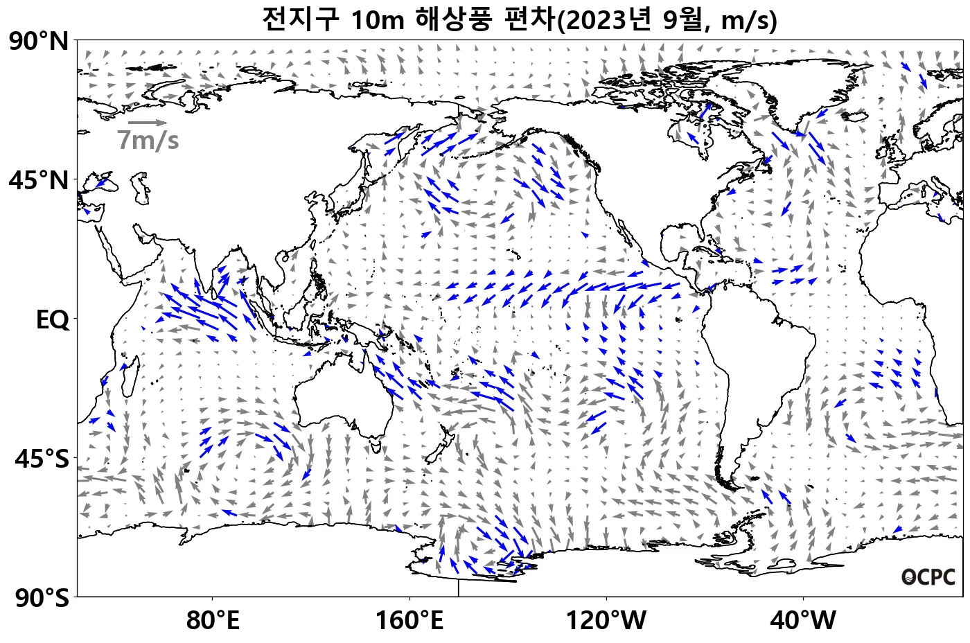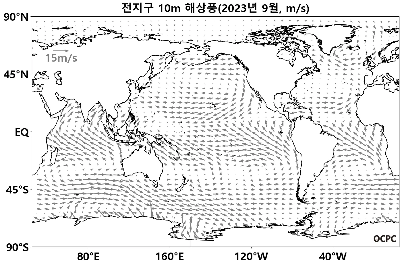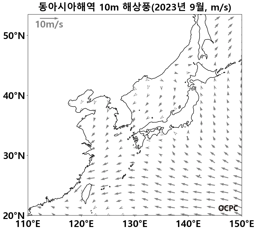 1993~2023년 동안 전지구, 동아시아해역의 9월 해상풍속은 10년에 0.1m/s씩 증가하는 추세이며,  동중국해는 10년에 0.1m/s씩 감소하는 추세입니다.