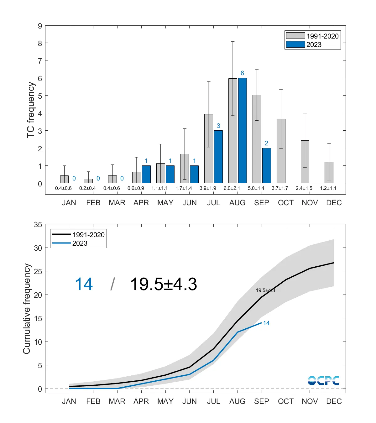 2023년 9월에는 평년(5.0개) 보다 적은 2개의 태풍이 발생하였습니다.
