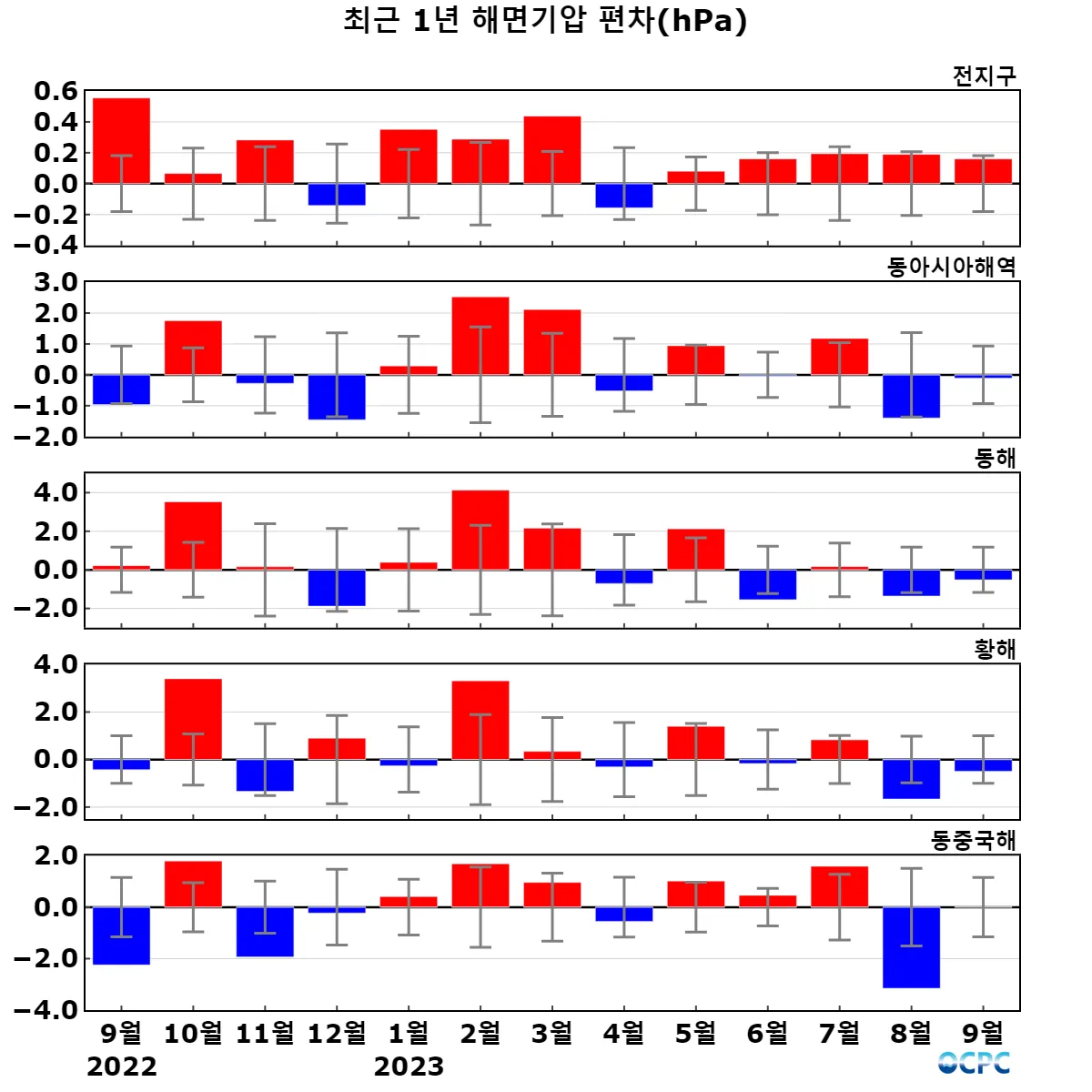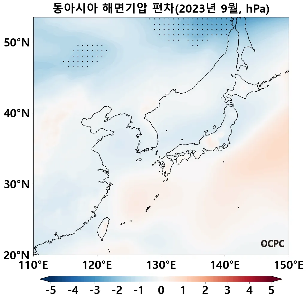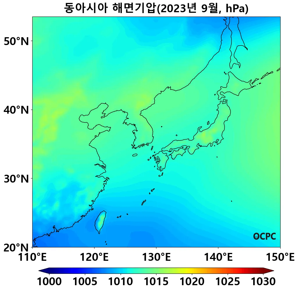 같은 기간 동해의 9월 해면기압은 10년에 0.3hPa 씩 증가하는 추세이며, 황해, 동중국해의 9월 해면기압은 10년에 0.1~0.2hPa 씩 감소하는 추세입니다.