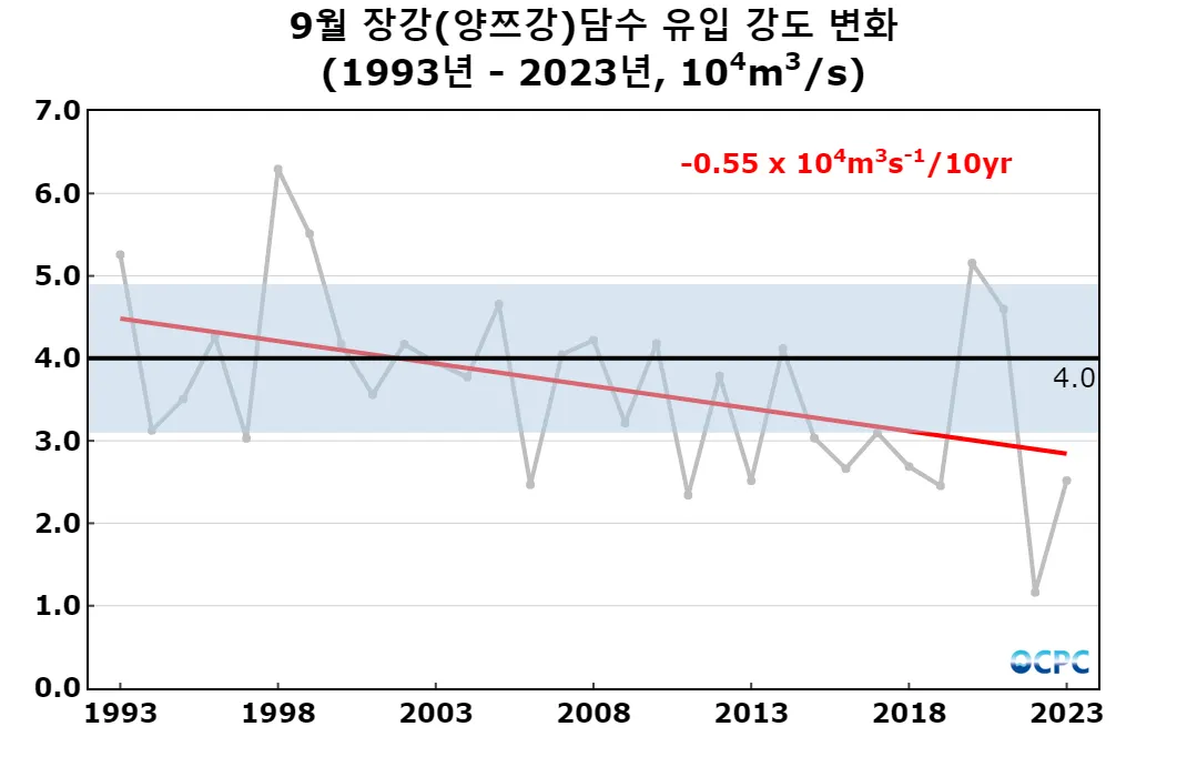 1993~2023년 동안 9월 장강 담수 유입 강도는 10년에 초당 5,500톤(한 달 동안 유입된 담수량으로 환산하면 10년에 14.3기가톤)씩 감소하는 추세입니다.