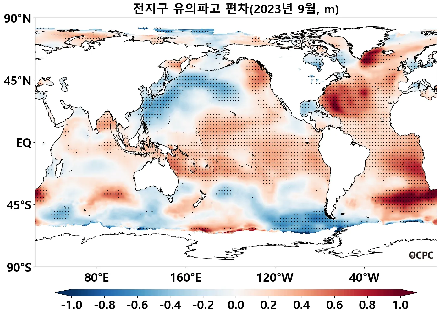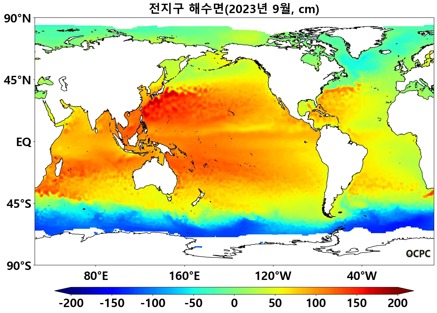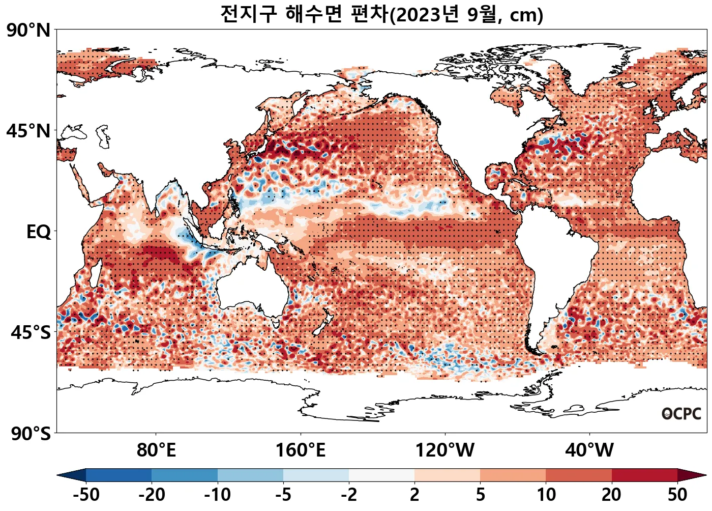 전지구 평균 해수면은 평년(58.3±2.7cm)보다 7.0cm 높았으며, 1993~2023년(9월) 중 가장 높았습니다. 특히, 엘니뇨의 발달으로 동태평양의 해수면이 평년보다 두드러지게 높았습니다.