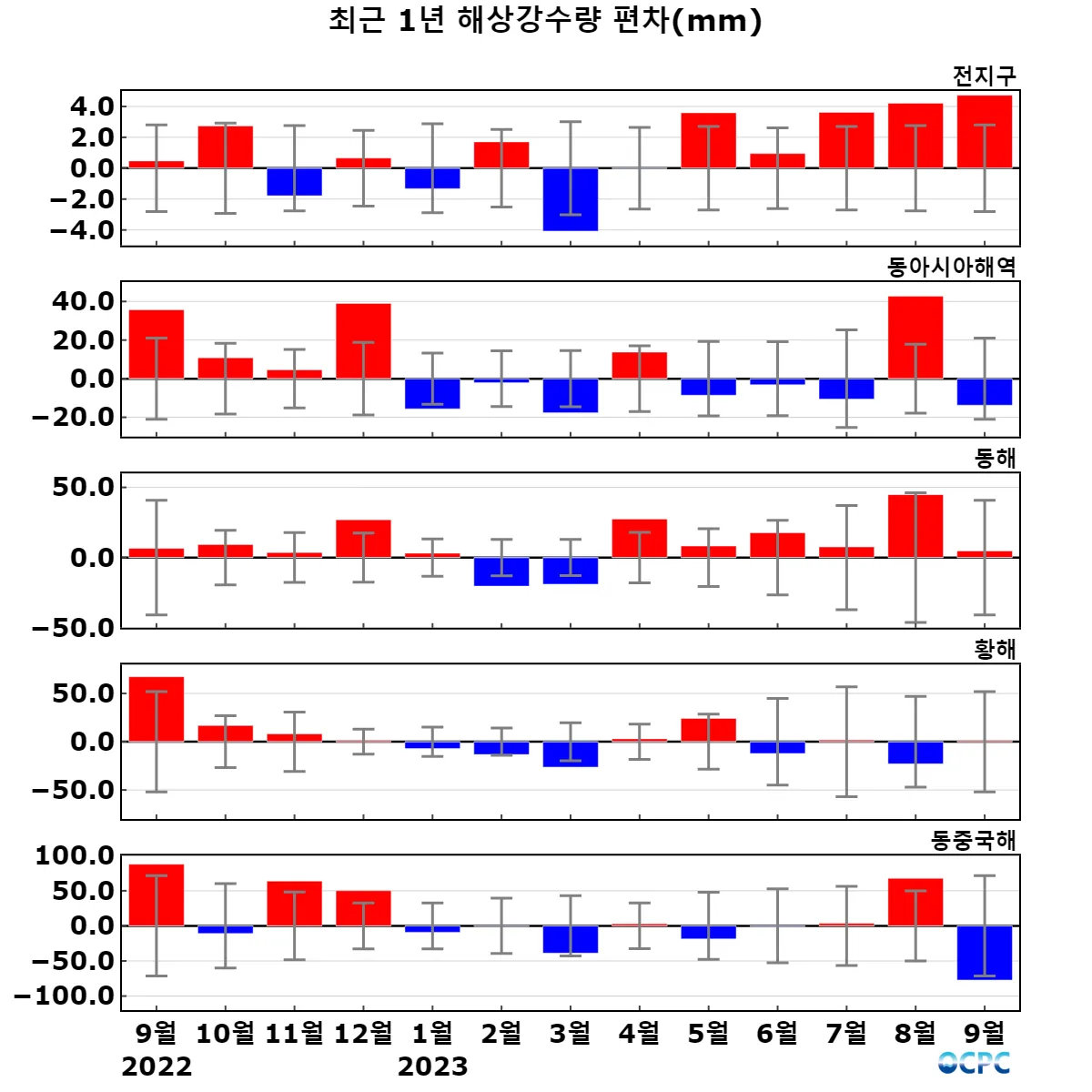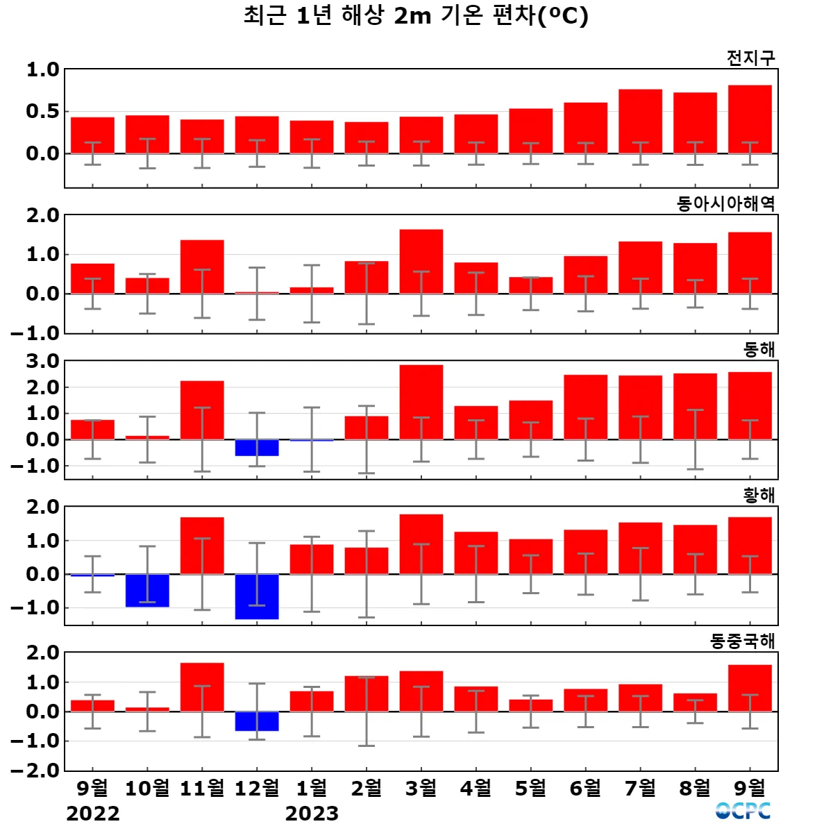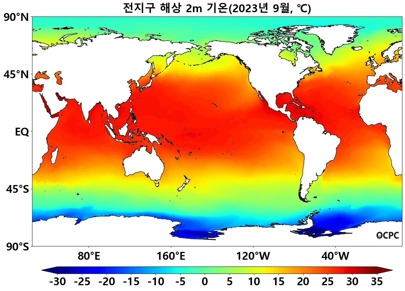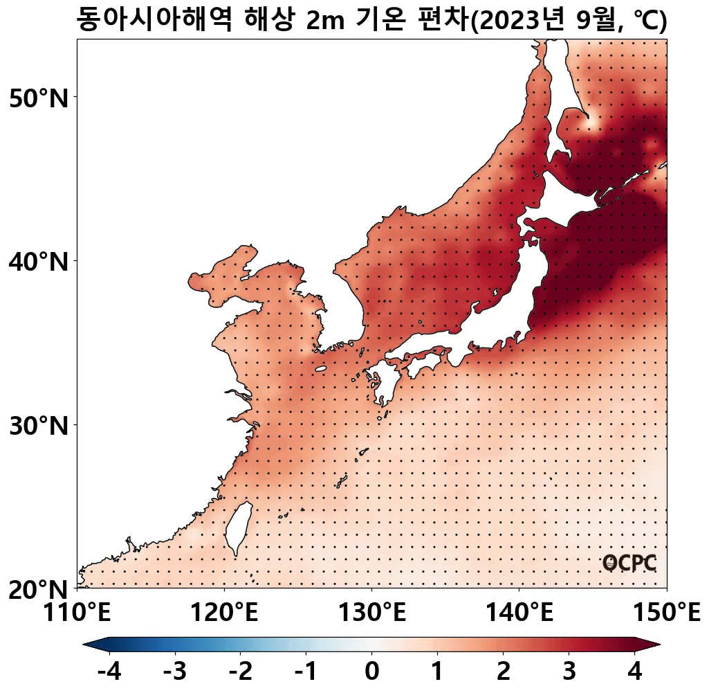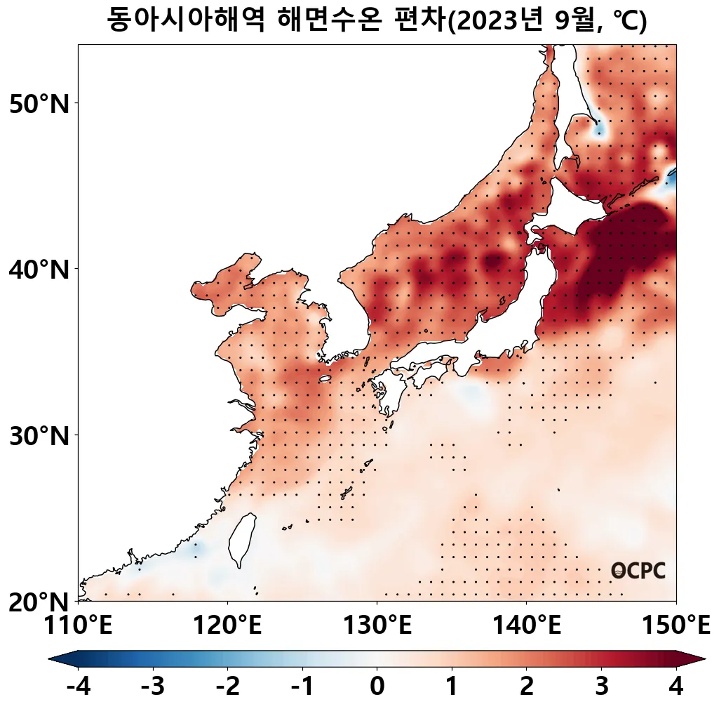 동해, 황해, 동중국해의 해상기온은 평년(19.6±0.7°C, 22.4±0.5°C, 25.8±0.6°C)보다 각각 2.6°C, 1.7°C, 1.6°C 높았으며, 1981~2023년(9월) 중 가장 높았습니다.